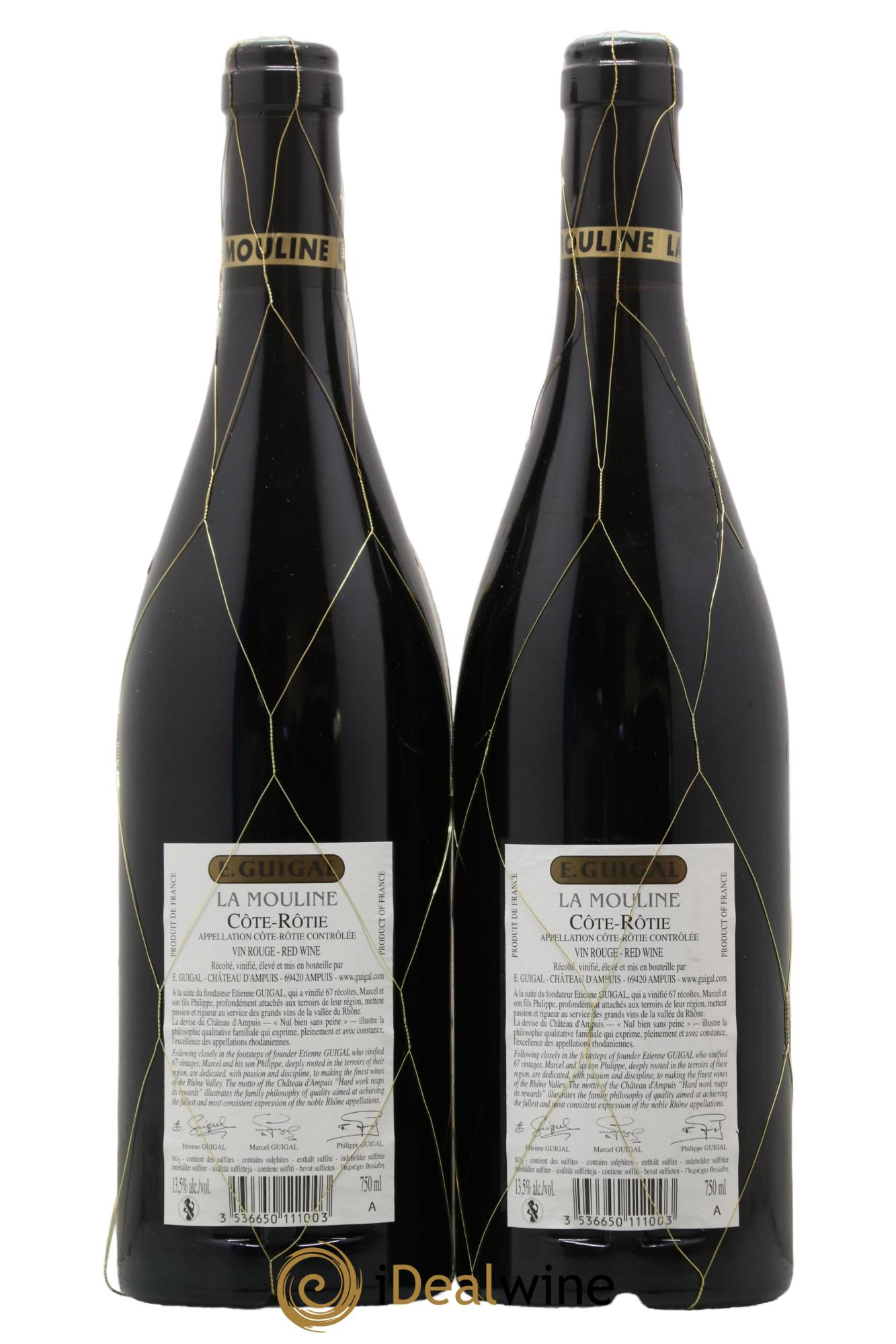 Die Parzelle La Mouline misst kaum einen Hektar und liegt an der Côte Blonde, deren symbolträchtige Lage sie bildet. Dieser Weinberg, der seit 1966 allein dem Haus Guigal gehört, ist mit 75 Jahren bemerkenswert alt und erfreut sich einer günstigen Südlage, die die Trauben voll ausreifen lässt. Die Weinberge erstrecken sich über Terrassen in Form eines römischen Amphitheaters. Der Wein von La Mouline muss 40 Monate in neuen Fässern reifen und ist der einzige des Dreiklangs LA-LA-LA mit einem so hohen Viognier-Anteil (11 %), der ihm Eve Guigal zufolge ein wahrhaft "burgundisches" Profil verleiht. Von außergewöhnlicher Feinheit und Mineralität entwickelt er subtile Cassis-, Brombeer- und Veilchen-Aromen. Seine samtige und seidige Konsistenz macht ihn bereits in jungen Jahren gut trinkbar, doch auch sein Reifepotenzial ist äußerst beeindruckend.
