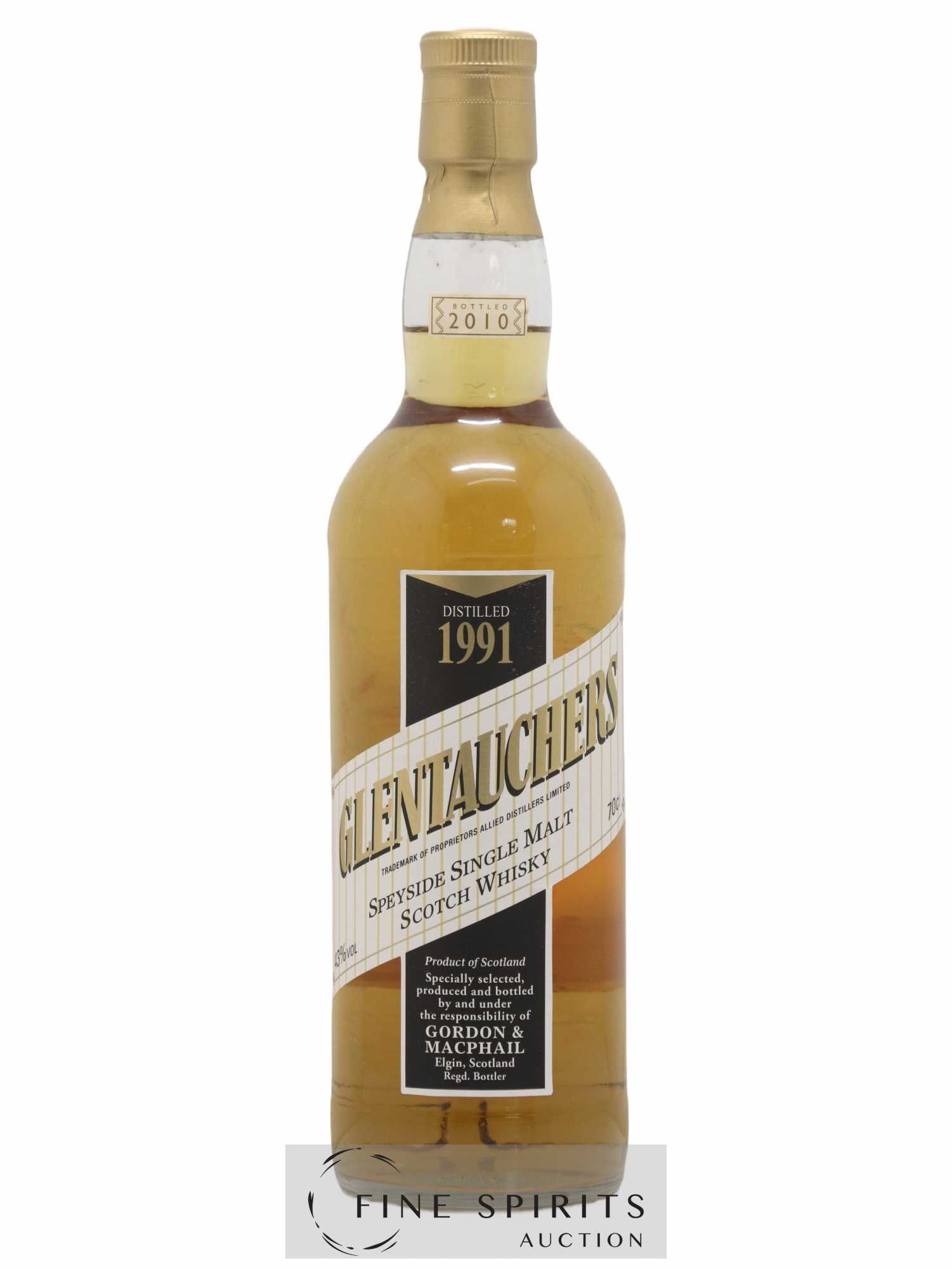 A Glentauchers distilled in 1991 and bottled by Gordon & MacPhail, one of Scotland’’s oldest independent bottlers. Gordon & MacPhail was founded in Elgin in 1895 by James Gordon and John Alexander MacPhail. As was often the case at the time, the business started out as a delicatessen and wine merchant. In 1915, John Alexander MacPhail retired and a new partner joined the business, John Urquhart. He was joined by his son George in 1933, a few years after James Gordon died in a car crash. Gordon & MacPhail works with many of Speyside’’s leading distilleries, from whom it has accumulated considerable stocks. It is also licensed to bottle whiskies for many of them, including Glen Grant, Linkwood, Mortlach, Macallan and Glenlivet. The business really took off in the 1970s, acquiring distributors in a huge range of countries and selling casks to several Italian bottlers in selections that would become legends in their own right. Gordon & MacPhail is still run by the Urquhart family today, from the same building, and is one of the most iconic bottlers in the industry, with incredible stocks of sometimes very old whiskies.