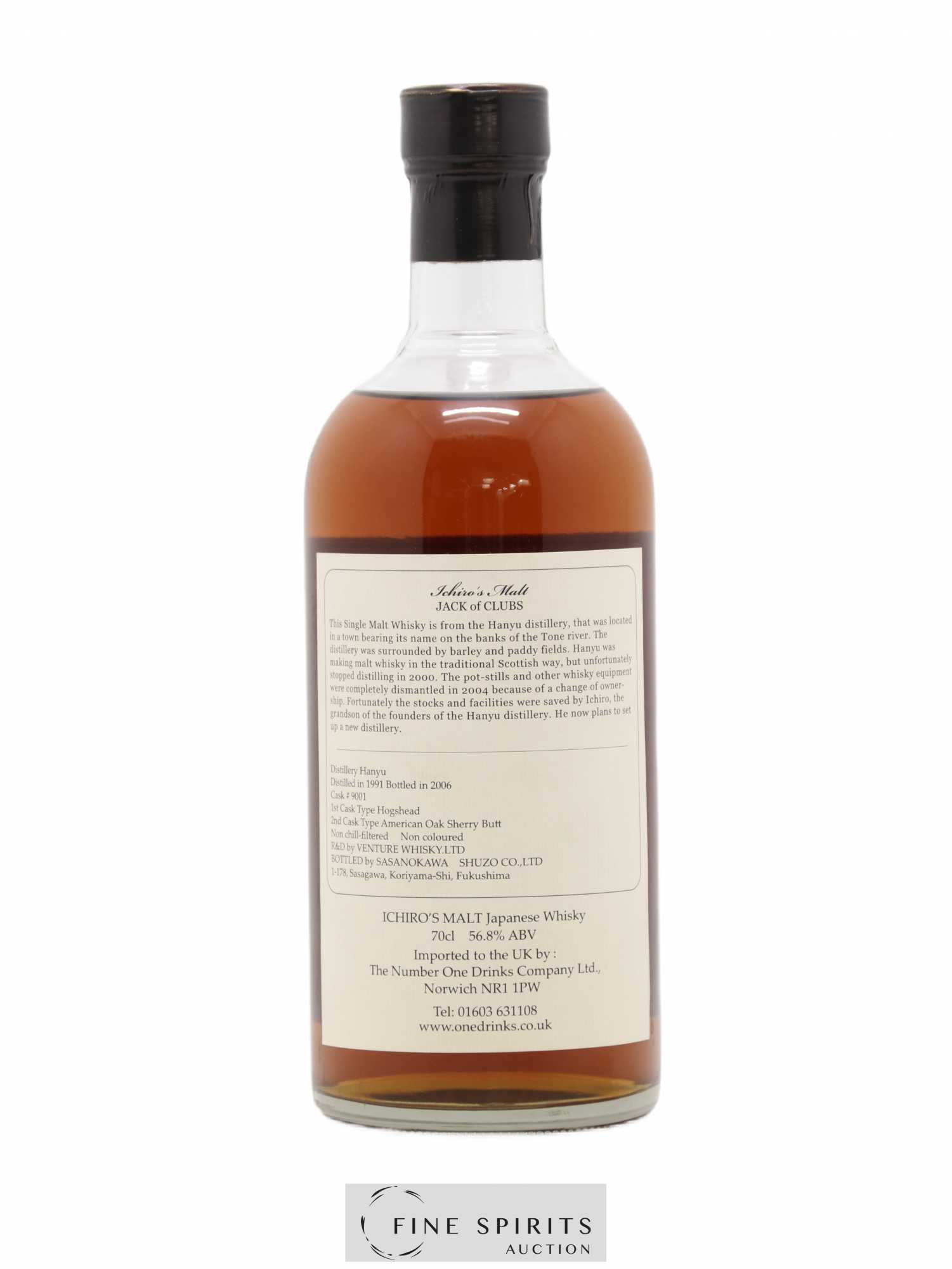 Single cask (#9001) Hanyu distillé en 1991 et embouteillé brut de fût en 2005 après un affinage en fût de sherry en chêne américain et un premier élevage en hogshead. La désormais très célèbre et convoitée série des cartes est née de la rencontre entre Ichiro Akuto et le dessinateur Takeshi Abe. Ichiro Akuto essaye alors de vendre les fûts de la distillerie de son grand-père. Le thème des cartes à jouer était séduisant: reconnaissables, les étiquettes des bouteilles sortent du lot et invitent à la collection. Pour distinguer aussi le contenu, chaque whisky a subi un affinage dans différents types de fûts, parfois très originaux, après une première maturation plus classique en hogshead. La série commence en 2005 et se termine en 2014 avec les deux jokers, le monochrome et le polychrome. Elle compte 58 embouteillages : 52 cartes, quatre doubles et deux jokers. Edition limitée à 124 bouteilles.
