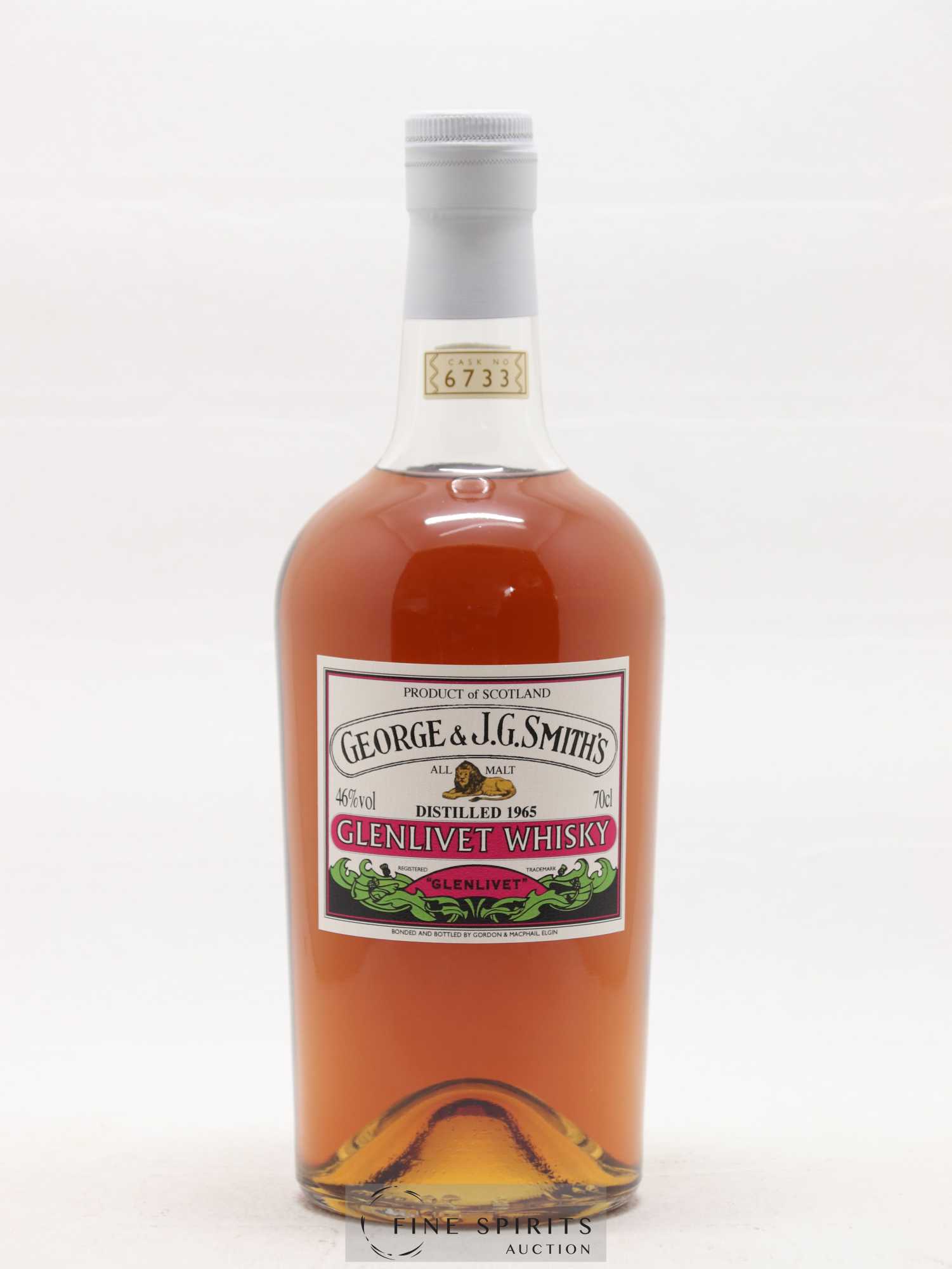Single cask (#6733) de Glenlivet distillé en 1965 et embouteillé en 2007 par Gordon & MacPhail, un des plus vieux négociants d'Ecosse. La maison est fondée à Elgin en 1895 par James Gordon et John Alexander Macphail. Comme souvent à l'époque, c'est une épicerie et un marchand de vin. En 1915, John Alexander MacPhail se retire et un nouveau partenaire rejoint l'entreprise, John Urquhart. Il est rejoint par son fils George en 1933, quelques années après le décès de James Gordon dans un accident de voiture. Le négociant travaille avec plusieurs distilleries majeures du Speyside dont il se constitue des stocks considérables. Gordon & MacPhail embouteille aussi sous licence les whiskies de nombre de ces distilleries comme Glen Grant, Linkwood, Mortlach, Macallan ou Glenlivet. Les affaires deviennent florissantes dans les années 1970 avec des distributeurs dans plusieurs pays et la vente de fûts à plusieurs embouteilleurs italiens ; des sélections souvent devenues mythiques. Aujourd'hui, Gordon & MacPhail, toujours dirigé par la famille Urquhart dans le bâtiment d'origine, est un des négociants les plus emblématiques de la profession avec des stocks pléthoriques de whiskies parfois très anciens dont on peine à trouver l'équivalent ailleurs. L'élevage est pris en charge du début à la fin par Gordon & MacPhail.