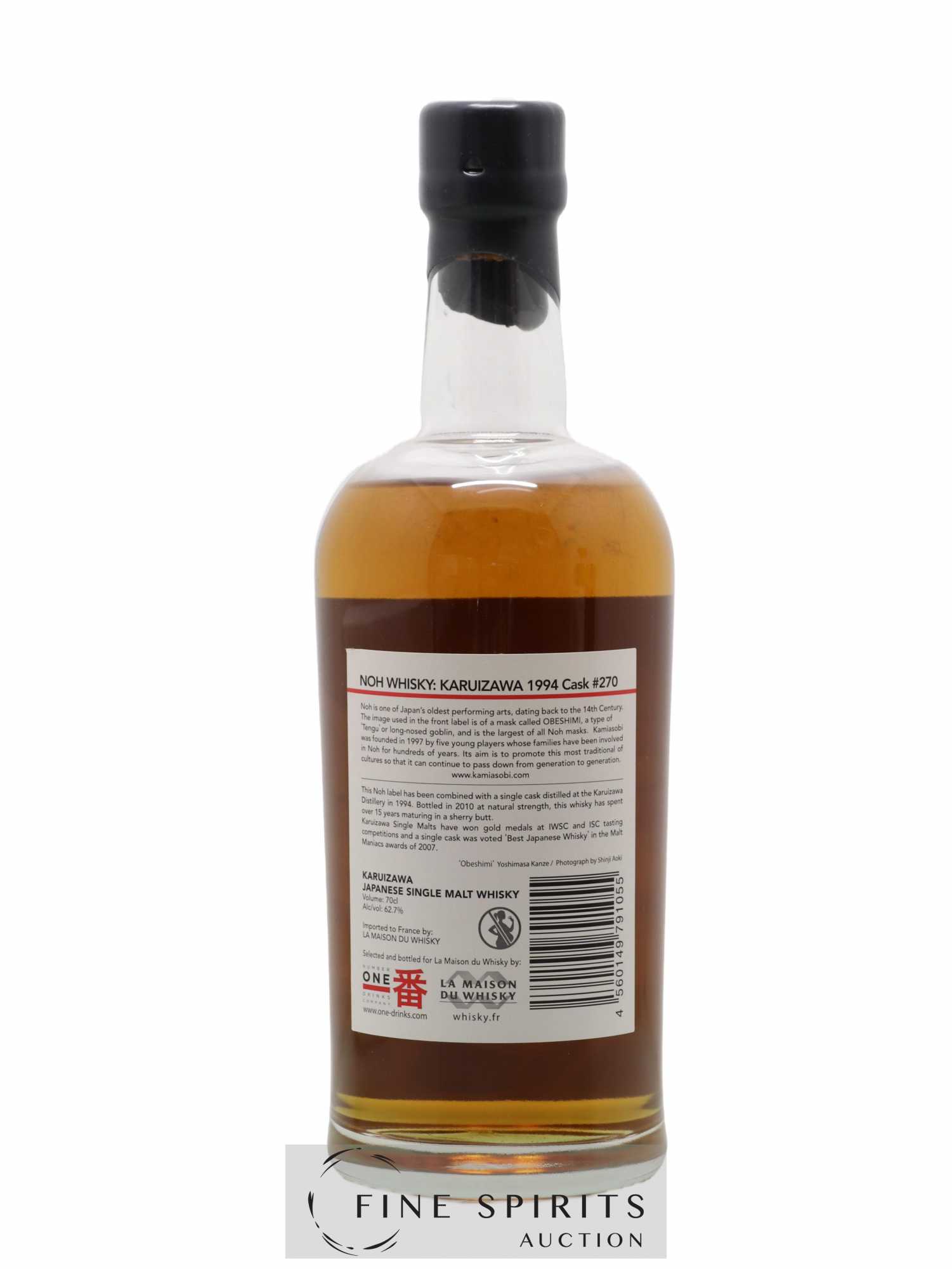 A single cask Karuizawa (#270) distilled in 1994 and bottled at cask strength in 2010 after 15 years of maturation in a sherry cask. This bottling is part of the Noh Whisky series from Number One Drinks, a company founded by David Croll and Marcin Miller in 2006, responsible for many bottlings of Karuizawa. The Noh Whisky series was produced in tribute to the Kamiasobi noh theatre company, formed in 1997 to continue the tradition of this Japanese art whose origins date back to the 14th century. A limited edition of 480 bottles for La Maison du Whisky.