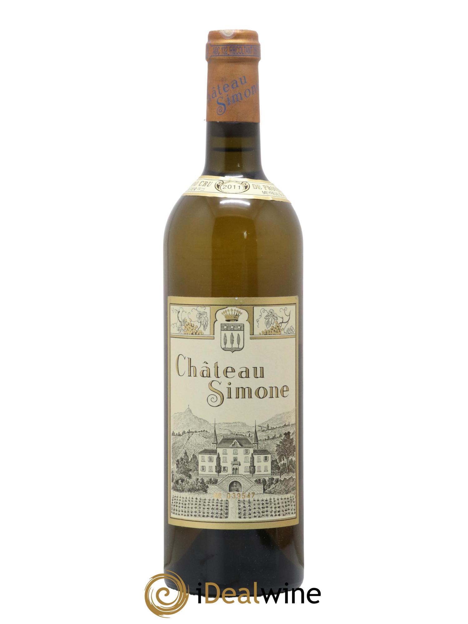 Der Weißwein des Château Simone ist berühmt für seine große Eleganz und sein fantastisches Reifepotenzial. In seiner Jugend zeichnet er sich durch eine goldene Robe und blumige und fruchtige Aromen aus, die sich hin zu einer altgoldenen Färbung und einem kräftigen und feinen Bukett entwickeln. Es handelt sich um eine Assemblage aus Clairette, Grenache Blanc, Ugni Blanc, Bourboulenc und Weißer Muskateller, vollreif und von Hand geerntet. Nach der Sortierung werden die Trauben leicht gepresst und gären mit natürlichen Hefen. Anschließend reift der Wein 18 Monate lang, davon sechs Monate auf der Feinhefe in kleinen Eichenfudern.