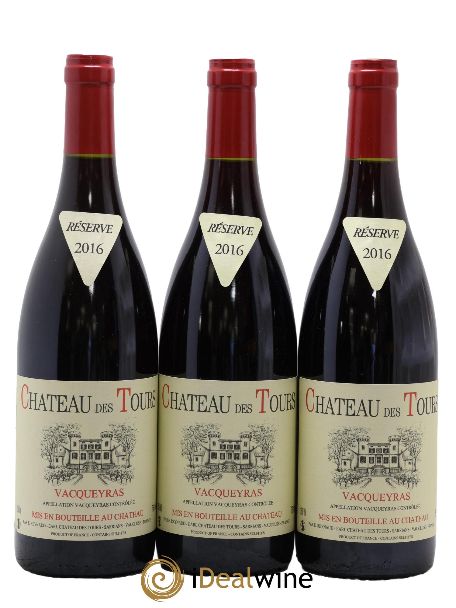 Das Château des Tours, in Sarrians in der Appellation Vacqueyras gelegen, gehört seit 1997 dem berühmten Emmanuel Reynaud, Eigentümer des legendären Château Rayas in Châteauneuf-du-Pape und des Château Fonsalette. Dieses Weingut produziert unter dem Namen Château des Tours auf 40 Hektar einen roten Vacqueyras (80 % Grenache und 20 % Syrah), einen roten Côtes-du-Rhône (65 % Grenache, 15 % Cinsault und 20 % Syrah) und einen weißen Côtes-du-Rhône (100 % Grenache). Unter dem Namen Domaine de Tours wird hier außerdem ein roter Vaucluse-Landwein (Grenache, Counoise, Syrah, Cinsault, Merlot und diverse andere Rebsorten) und ein weißer Vaucluse-Landwein (100 % Clairette) hergestellt. Und zu guter Letzt findet man hier auch einen Rosé-Tafelwein namens „Parisy“, der aus Grenache und Cinsault zusammengestellt ist. In jedem Fall wird den roten und weißen Grenache-Trauben alle Ehre gemacht. Der Weinbau ist von extremer Sorgfalt geprägt und bei der Lese werden große Risiken eingegangen. Tatsächlich werden die Trauben so reif wie möglich geerntet. Dieses Weingut produziert Weine auf höchstem Niveau: Ihre Farbe ist wenig intensiv, aber dennoch sind die Weine extrem tiefgründig, schlank, fruchtig und außergewöhnlich ausgewogen. Besonders bekannt und nachgefragt sind sie für ihre Komplexität und ihr Reifepotenzial. Wissenswert ist außerdem, dass Flaschen vom einfachen Landwein bis zum Vacqueyras erst nach einigen Jahren der Lagerung am Weingut verkauft werden.