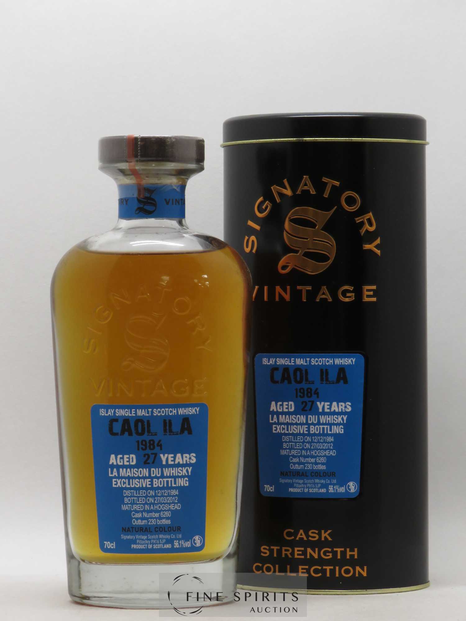 Single Cask (#6260) Caol Ila, destilliert im Jahr 1984 und abgefüllt im Jahr 2012 nach 27 Jahren Reifung im Hogshead in Fassstärke vom schottischen Händler Signatory Vintage. Limitierte Auflage von 230 Flaschen für La Maison du Whisky.
