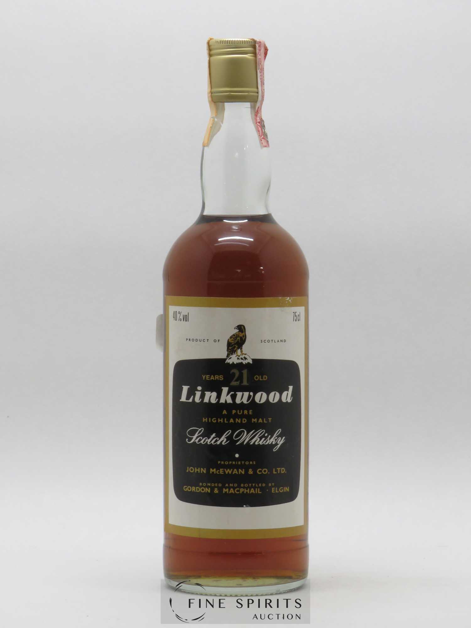 21 Jahre lang gereifter Linkwood, abgefüllt durch Gordon & MacPhail und nach Italien importiert von Mario Rossi. Distillers Company Limited (DCL) hat Gordon & MacPhail gestattet mehrere ihrer Single Malts (Linkwood, Mortlach und Talisker) in den 1970er- und 1980er-Jahren unter Lizenz abzufüllen. Das Handelshaus erstellt für jede Brennerei ihr eigenes, mit einem Adler verziertes Etikett und verleiht ihnen eine visuelle Identität, die Gordon & MacPhail bis heute für seine Abfüllungen nutzt. Ende der 1980er-Jahre gibt DCL, nun umbenannt in United Distillers, die Lizenzen an seine Brennereien zurück, doch Gordon & McPhail kauft weiterhin ihre Whiskys und füllt sie ab. Sie gehören heute zu der Reihe Distillery Labels, die die alten Abfüllungen unter Lizenz wieder aufgreift. Diese Abfüllungen sind historisch besonders bedeutend, da sie oft als halboffizielle Abfüllungen für viele Brennereien neben den oben bereits genannten fungierten, die zuvor im Schatten der Blend-Marken standen die sie belieferten.