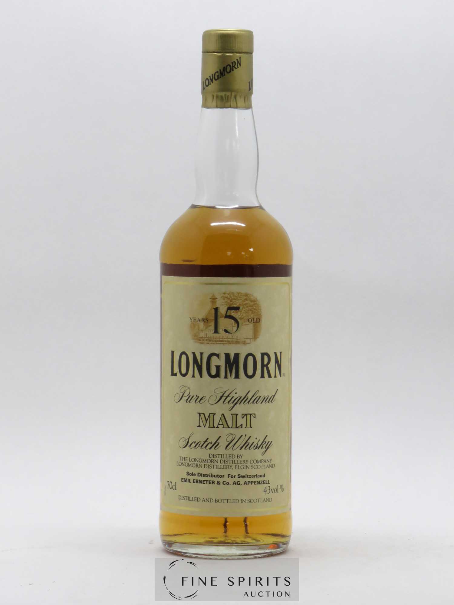Ein Longmorn 15 Years, in den 1980er Jahren abgefüllt. Es handelt sich um eine Flaschenabfüllung für den Schweizer Markt, die von der Firma Emil Ebneter & Co. AG aus Appenzell importiert wurde. Er wurde abgefüllt als die Brennerei noch im Besitz der Gruppe The Glenlivet Distillers war. Diese Version wurde produziert, als Longmorn noch mit vier Destillierkolben destillierte, die mit Kohle aufgeheizt wurden.
