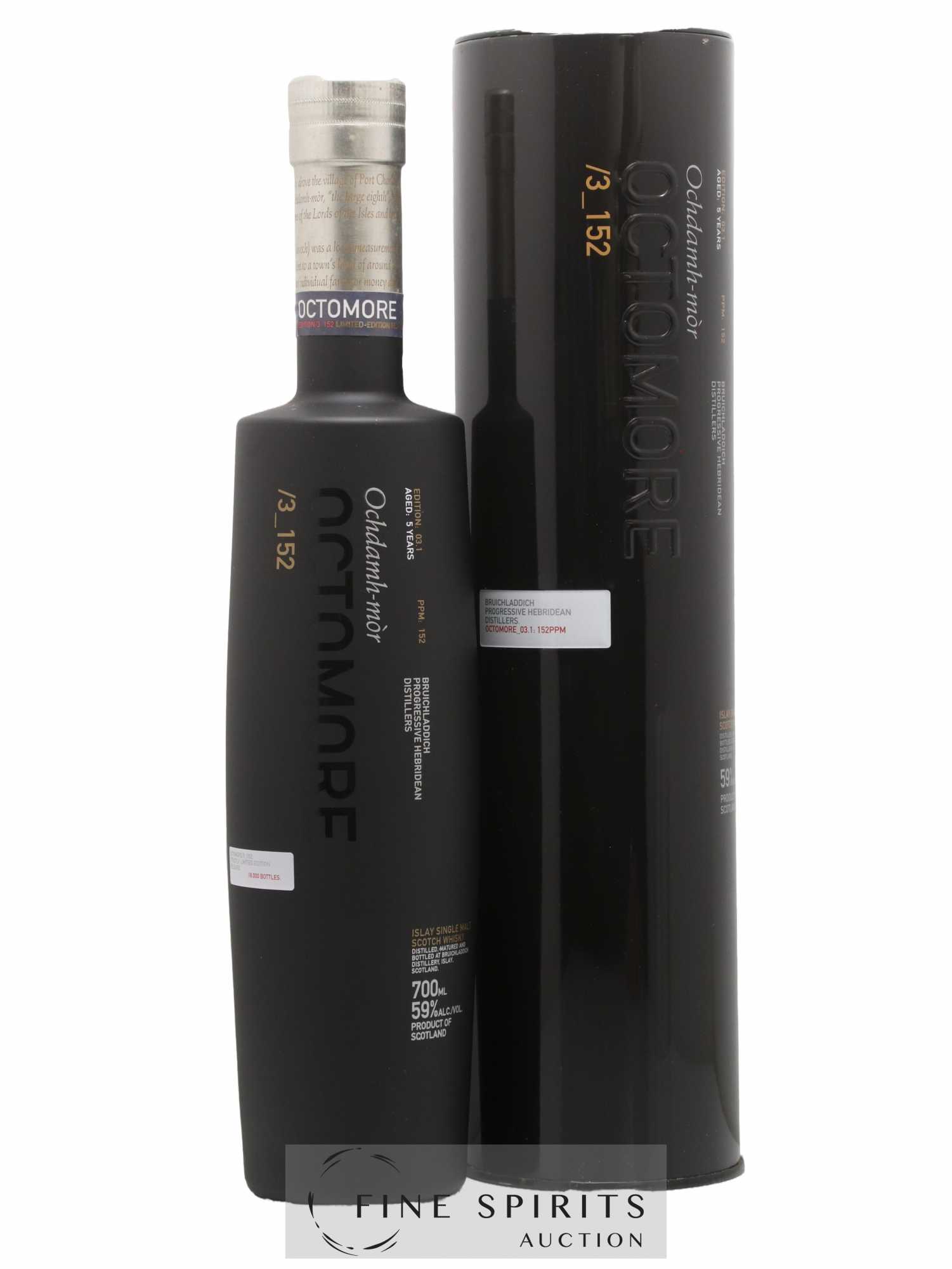 Octomore 3.1, als die dritte Auflage von Octomore, fünf Jahre lang im Bourbon-Fass gereift. Die verwendete Gerste stammt aus schottischem Anbau. Der Torfgehalt (152 ppm) war damals ein Rekord, wurde inzwischen aber von anderen Octomore-Auflagen weit übertroffen. Limitierte Auflage von 18 000 Flaschen.