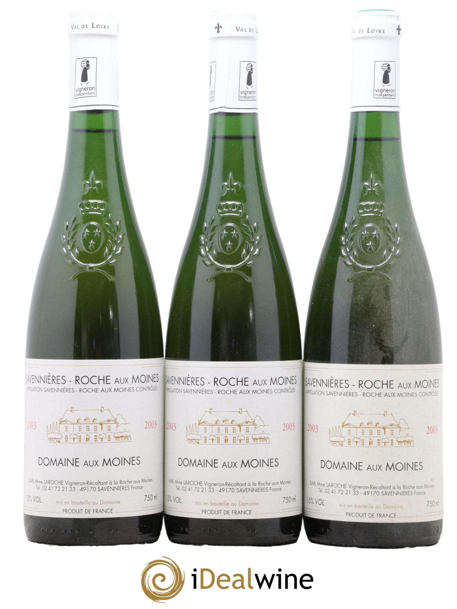 Quantity: 3 bottlesObservation: 3 Marginally marked labelsLevel: 3 NormalOrigin: private individualRecoverable VAT: noRegion: Loire ValleyAppellation: Savennières Roche aux MoinesOwner: Domaine aux Moines