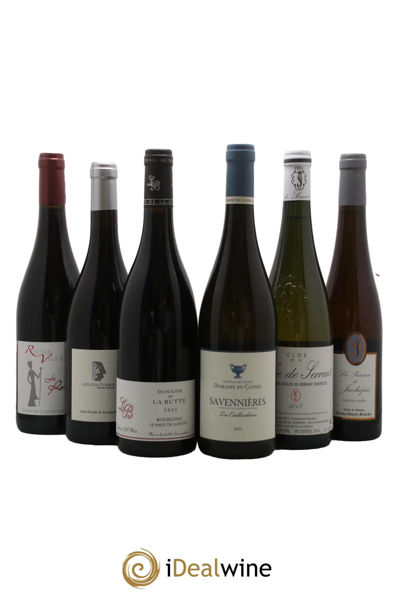 Quantity: 6 bottlesObservations: 5 Marginally marked labels, 1 Slightly marked label, 1 Slightly damaged labelLevel: 6 NormalOrigin: private individualRecoverable VAT: noRegion: Loire ValleyAppellation: Assortiment de vins d'Anjou noir - Saumur - BourgueilComments:coteaux du layon Faye Domaine Juchepie Chenin noble la passion de Juchepie 2017(50cl)/Bourgueil Haut de la butte Domaine de la butte 2022/Savennières Clos de la Coulée de Serrant Vignobles de la Coulée de Serrant Nicolas Joly 2017/Saumur Champigny Domaine de Rocheville Le Roi 2019/Savennières les Caillardières Domaine du Closel 2022/Saint Nicolas de Bourgueil Frederic Mabileau Les coutures 2021