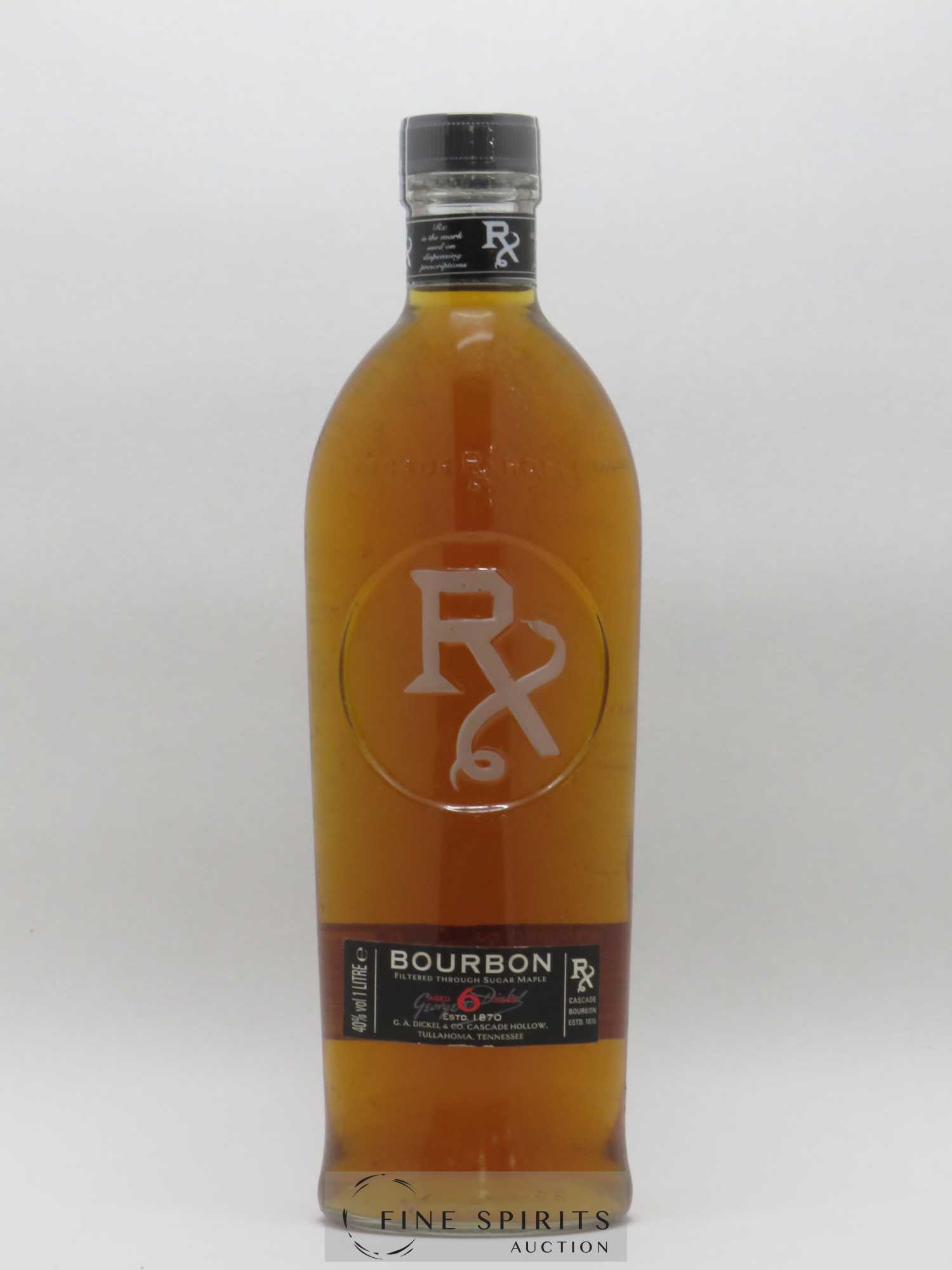 A 6 year old RX bourbon that has been filtered through sugar maple. Produced at the Cascade Hollow distillery in Tullahoma, Tennessee. RX succeeded the Cascade brand created in 1870. It survived Prohibition by being sold as prescription medication under the name RX. This name was kept after the end of Prohibition.