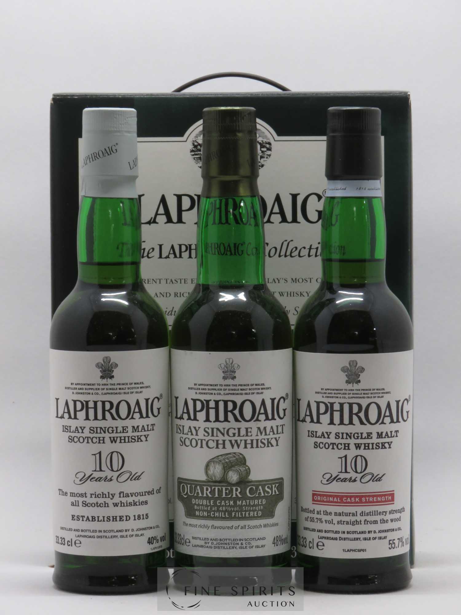 Three 33.33 cl bottles: -one Laphroaig 10 year old, the distillery classic since the 1950s-one Laphroaig quarter cask, introduced in 2004 for duty free markets then incorporated into the regular range; matured for five years then finished for seven months in a small quarter cask-one Laphroaig 10 year old Original Cask Strength, introduced in 1995 under the name “Straight from the wood”, now found in numbered batches.