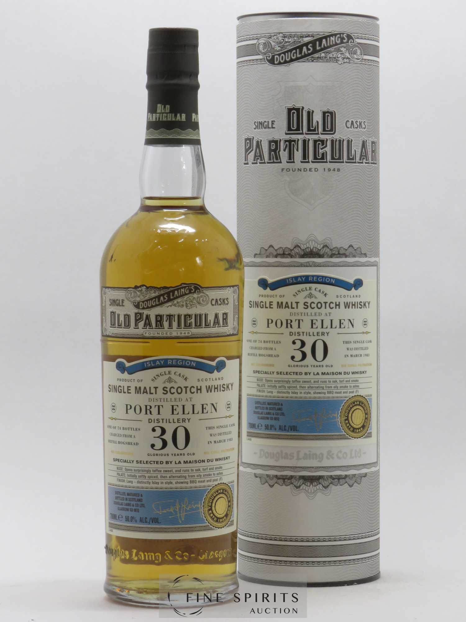 A single cask Port Ellen distilled in 1983—the year the distillery closed—bottled by Douglas Laing for the Old Particular range, matured for 30 years in a refill hogshead. Douglas Laing was founded in 1948 by Fred Douglas Laing, primarily as a blending company but also as an independent bottler, an activity which grew over the years. The Old Particular range is reserved for single casks bottled either at cask strength or near cask strength without chillfiltration or artificial colouring. A limited edition of 74 bottles for La Maison du Whisky.