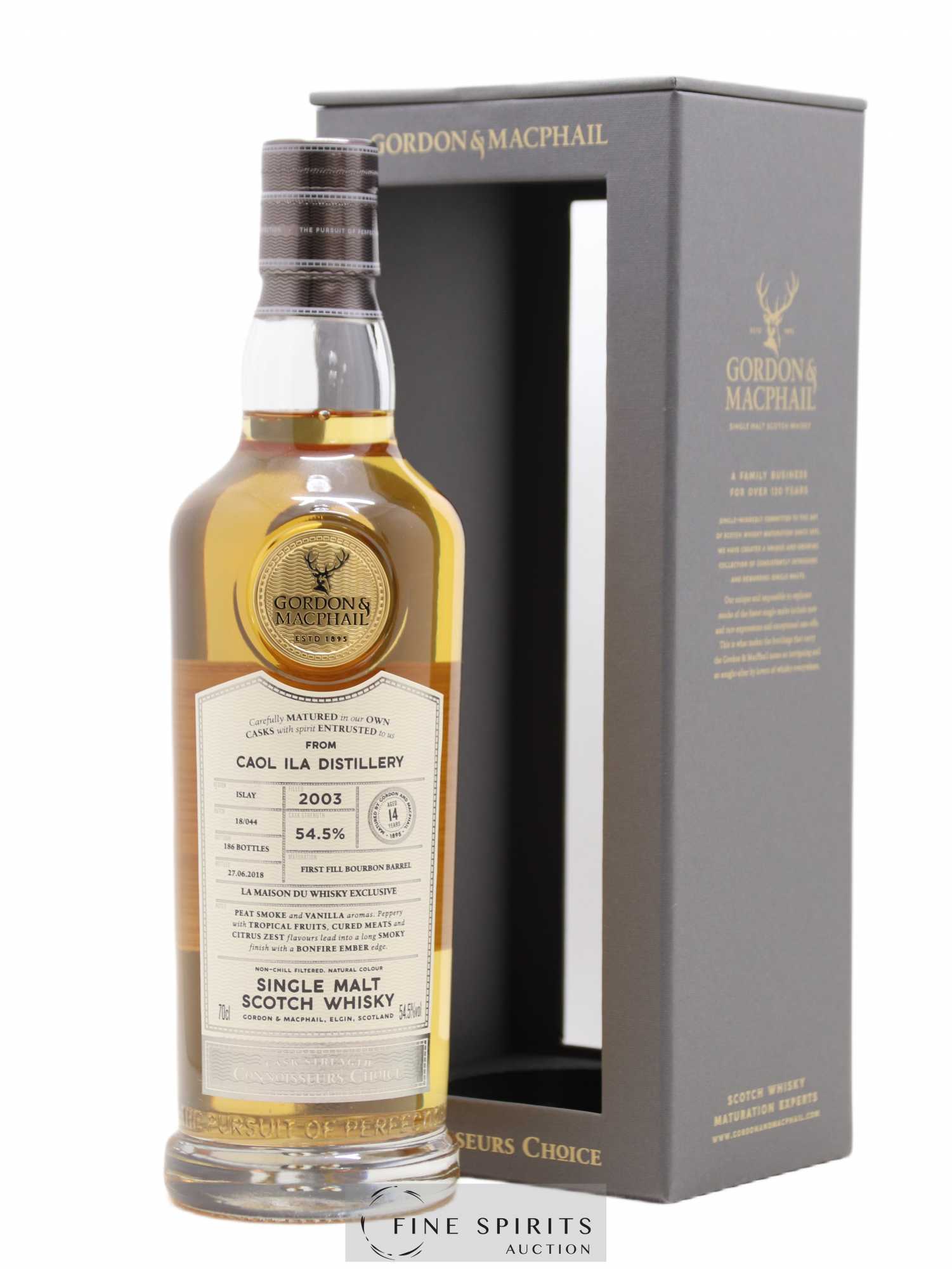 A Caol Ila 14 year old distilled in 2003 and bottled in 2018 after ageing in a first-fill bourbon cask. Gordon & MacPhail is one of Scotland’’s oldest independent bottlers. It was founded in Elgin in 1895 by James Gordon and John Alexander MacPhail. As was often the case at the time, the business started out as a delicatessen and wine merchant. In 1915, John Alexander MacPhail retired and a new partner joined the business, John Urquhart. He was joined by his son George in 1933, a few years after James Gordon died in a car crash. Gordon & MacPhail works with many of Speyside’’s leading distilleries, from whom it has accumulated considerable stocks. It is also licensed to bottle whiskies for many of them, including Glen Grant, Linkwood, Mortlach, Macallan and Glenlivet. The business really took off in the 1970s, acquiring distributors in a huge range of countries and selling casks to several Italian bottlers in selections that would become legends in their own right. Gordon & MacPhail is still run by the Urquhart family today, from the same building, and is one of the most iconic bottlers in the industry, with incredible stocks of sometimes very old and rare whiskies. The company is in complete control of the entire maturation process. Gordon & MacPhail has also owned the Benromach distillery since 1993. A limited edition of 186 bottles for La Maison du Whisky.
