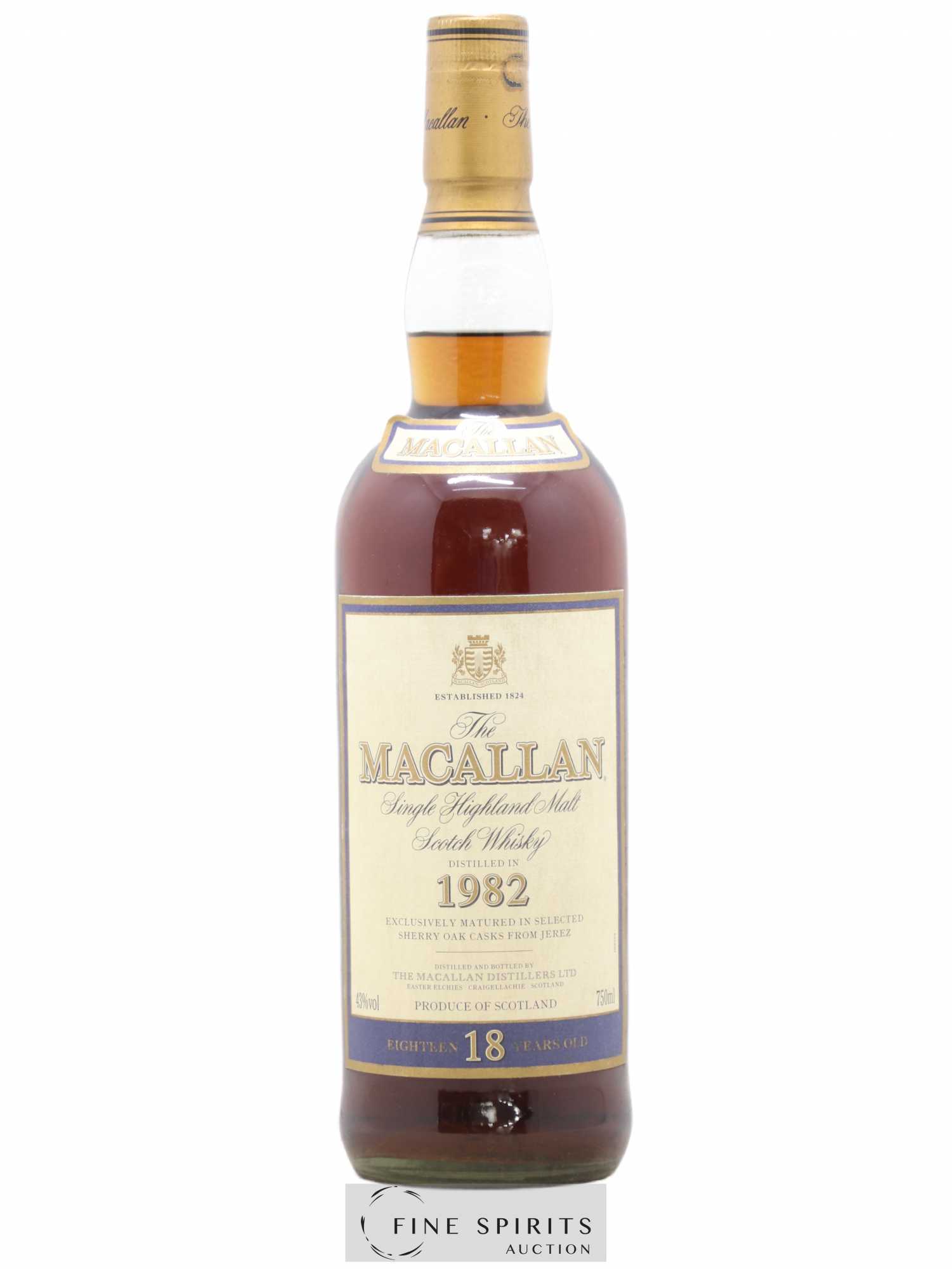 A Macallan 18 year old distilled in 1982. There have been many Macallan 18 Year Olds, with vintages dating back to 1965 and bottlings to 1984. When Macallan recovered its bottling rights from Campbell, Hope and King in 1980, it added a 17 year old and 18 year old to the existing range, which was until then focused on vintage 15 year olds and, to a lesser extent, 8 year olds and 12 year olds. It was this 18 year old that became a long-lasting staple and classic of the range.