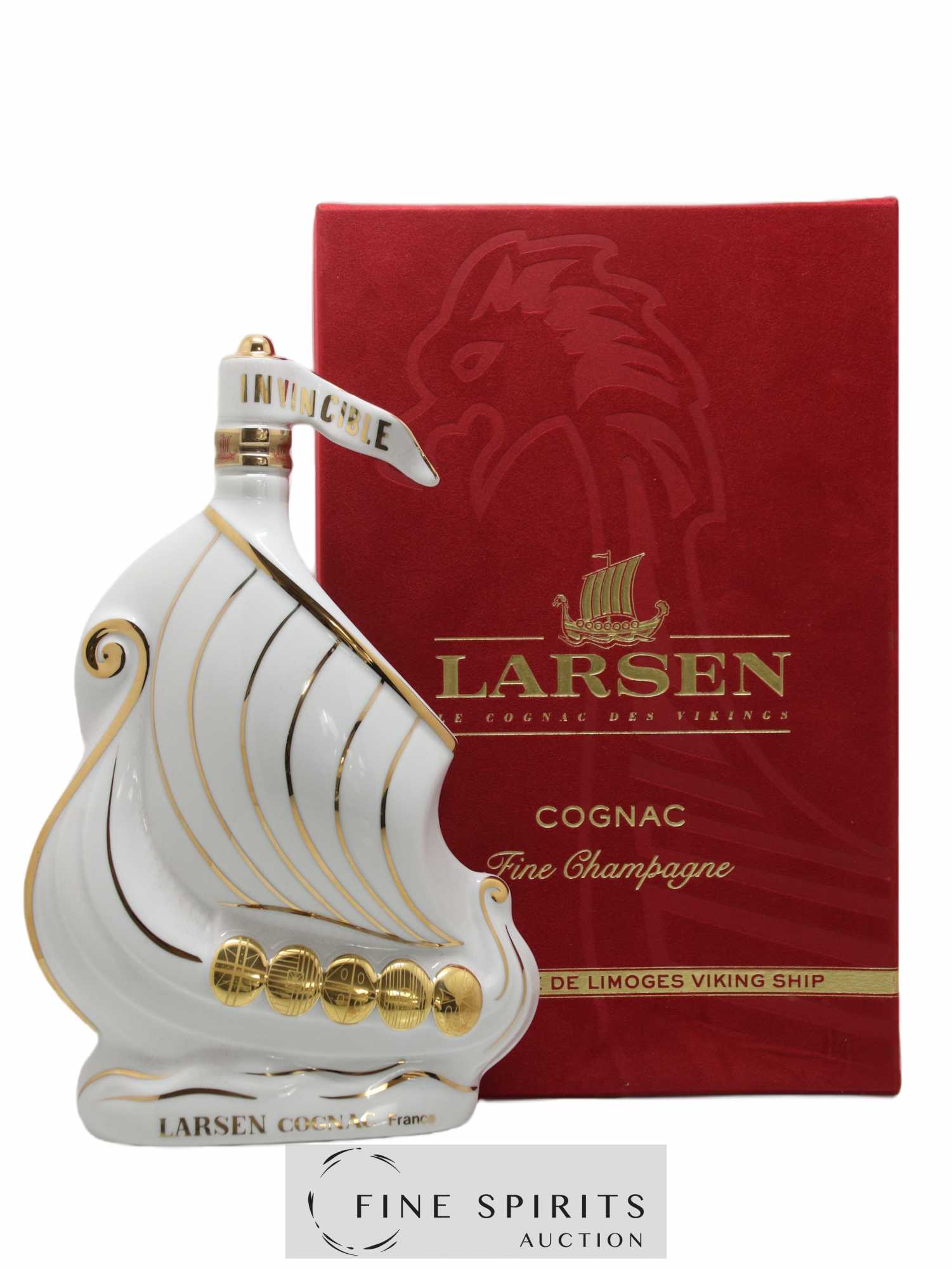 Cognac Larsen is a Fine Champagne cognac made with grapes grown in the most prestigious crus in the appellation, Grande Champagne and Petite Champagne. It is presented here in a Limoges porcelain decanter in the shape of a Viking long ship, hand-carved with 24-carat gold. This original decanter reflects the history of the house, which was founded in 1926 by Jens Reidar Larsen, who originally left on a ship for America but ultimately ended up settling in Cognac after a stop-over in Bordeaux.