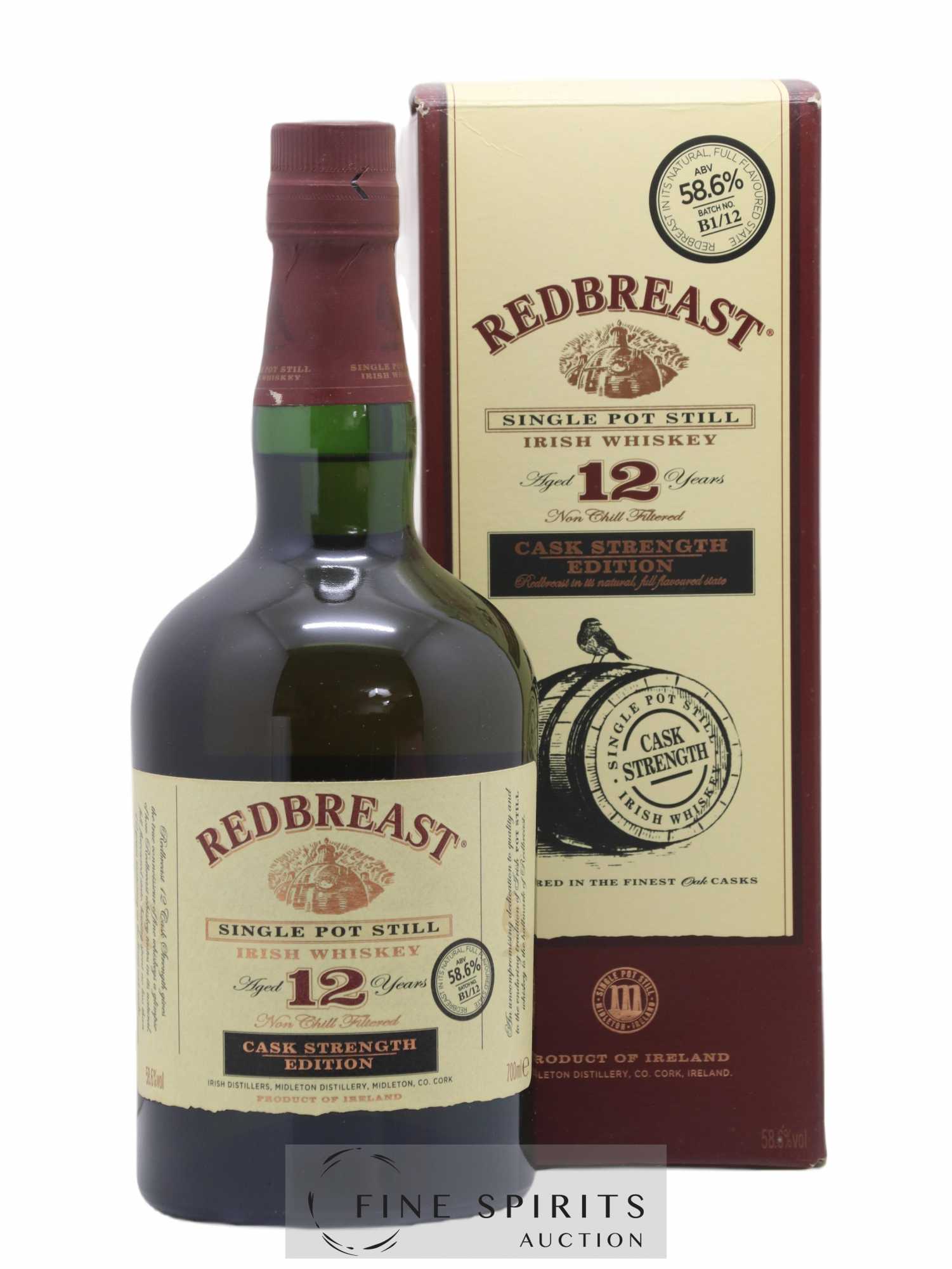 Batch B1/12 of Redbreast 12 Year Old Cask Strength. Redbreast is a single pot still whiskey, meaning it is made with malted and unmalted barley and triple-distilled in pot stills.