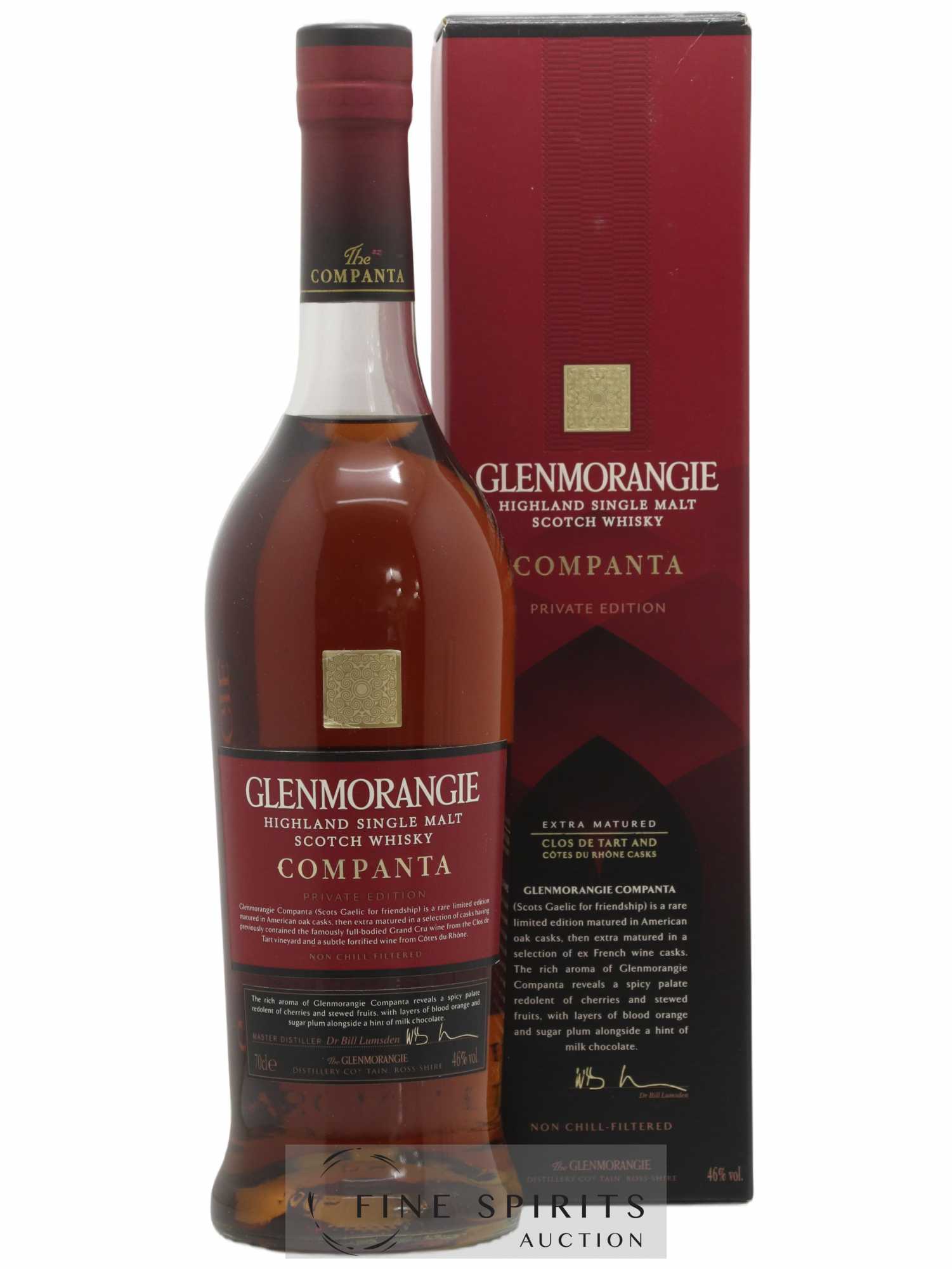 Glenmorangie Companta was initially matured in American oak casks. 60% of the whisky was then finished in a Burgundy wine cask (Clos du Tart, Morey-Saint-Denis) and the other 40% in a Côtes du Rhône fortified wine cask. It was designed by Dr Bill Lumsden, a man known for his creative approach to maturation.