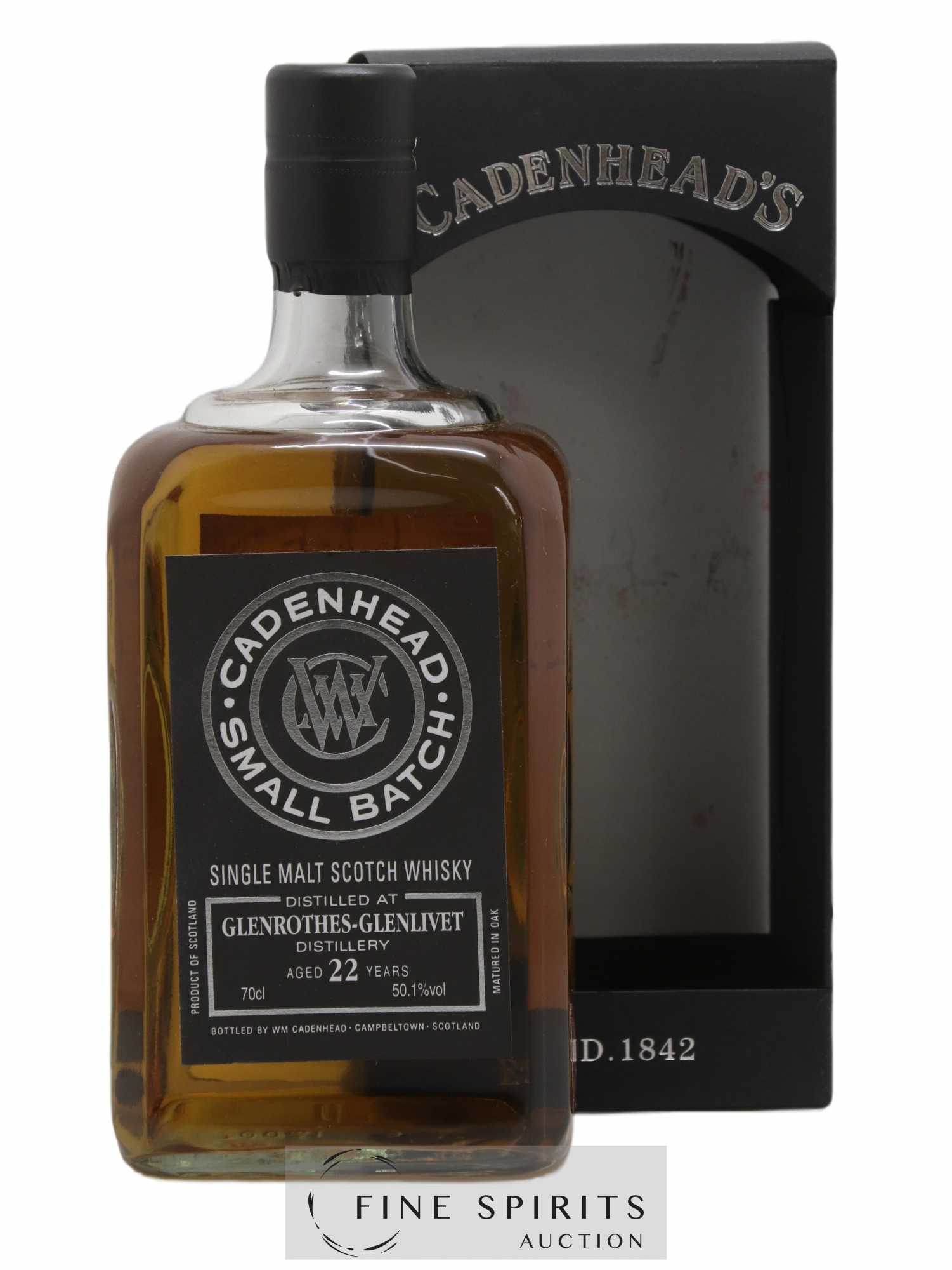 A Glenrothes 22 year old distilled in 1996 and bottled in 2019. Cadenhead was founded in 1842 by George Duncan, who was quickly joined by William Cadenhead, who renamed the business after Duncan’’s death in 1858. When Cadenhead in turn passed away in 1904, his nephew Robert Duthie took over and turned the business into the independent bottler it is today. After Duthie, it was managed by one of his employees, Ann Olivier, whose stubborn approach to running the business led to much of the stock having to be sold at auction by Christie’’s (London) in 1972 to feed the kitty and save the business. It was then sold to J. & A. Mitchell and Co, who also owned Springbank, and moved to Campbeltown. A limited edition of 942 bottles.