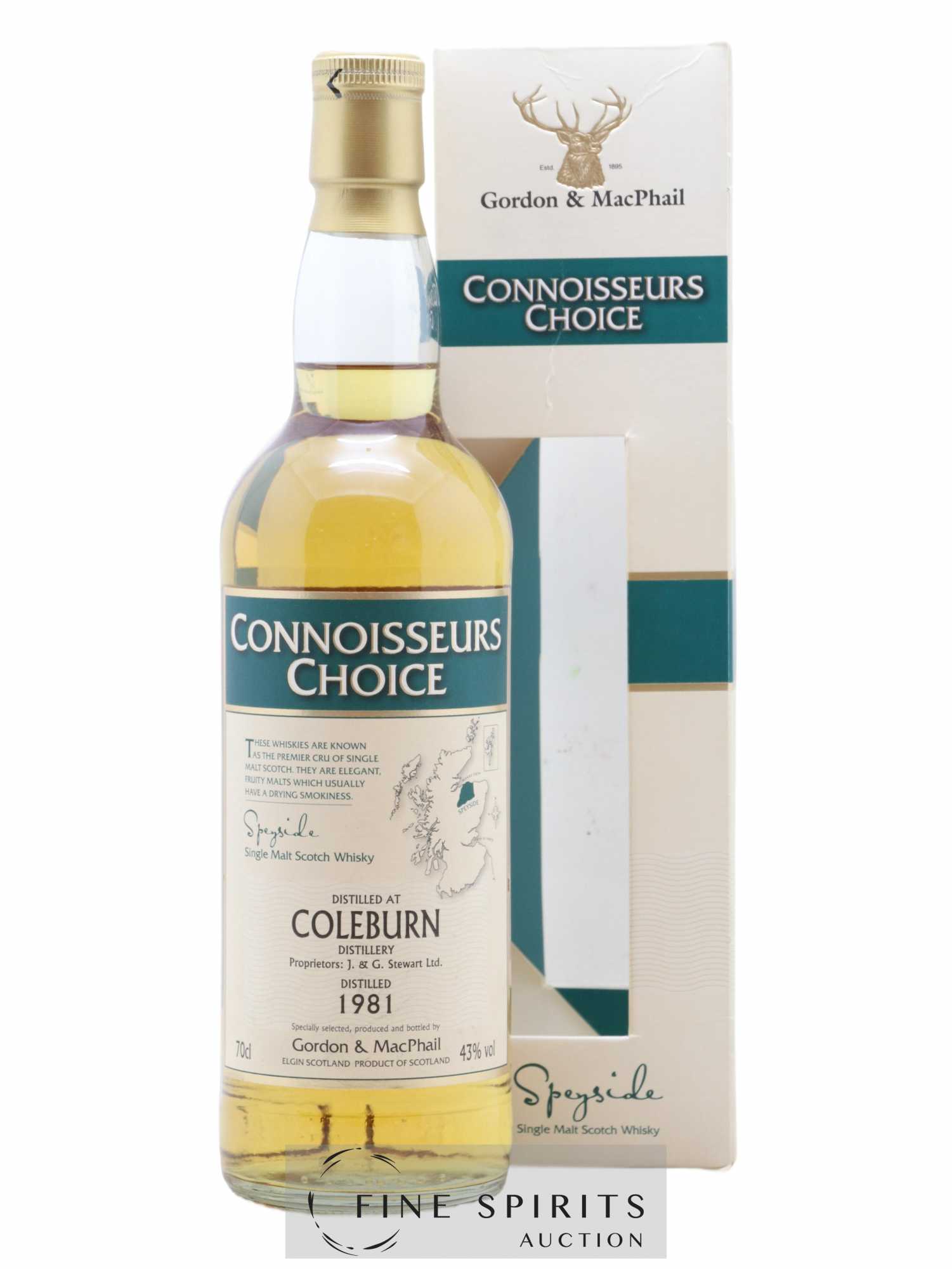 A Coleburn distilled in 1981 and bottled in 2008 by Gordon & MacPhail, one of Scotland’’s oldest independent bottlers. Gordon & MacPhail was founded in Elgin in 1895 by James Gordon and John Alexander MacPhail. As was often the case at the time, the business started out as a delicatessen and wine merchant. In 1915, John Alexander MacPhail retired and a new partner joined the business, John Urquhart. He was joined by his son George in 1933, a few years after James Gordon died in a car crash. Gordon & MacPhail works with many of Speyside’’s leading distilleries, from whom it has accumulated considerable stocks. It is also licensed to bottle whiskies for many of them, including Glen Grant, Linkwood, Mortlach, Macallan and Glenlivet. The business really took off in the 1970s, acquiring distributors in a huge range of countries and selling casks to several Italian bottlers in selections that would become legends in their own right. Gordon & MacPhail is still run by the Urquhart family today, from the same building, and is one of the most iconic bottlers in the industry, with incredible stocks of sometimes very old whiskies. The Connoisseurs Choice range is one of Gordon & MacPhail’’s spearhead collections. Created for the Italian collector and importer Edoardo Giaccone in the early 1970s, it became part of the permanent range in 1979 and has remained so ever since, despite changing greatly, from red and black labels to map labels and today’’s design, as well as the gradient label. Older editions were bottled at 40% and coloured artificially. Today, the whiskies in the range display their natural colouring and are often cask strength.
