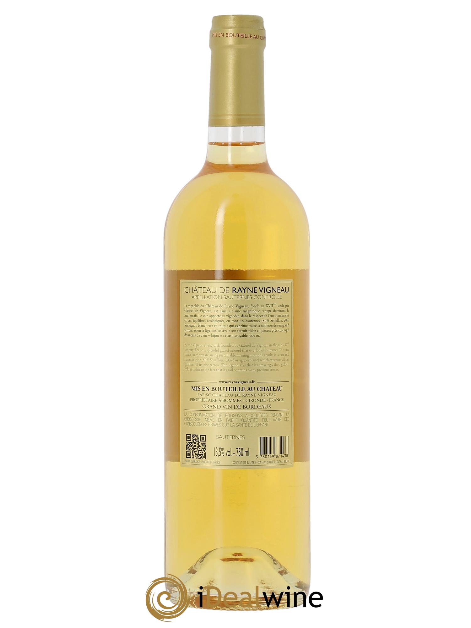 La butte de Rayne Vigneau est connue des géologues pour ses pierres précieuses (agathes, améthystes, onyx, saphirs), mais aussi pour l'exceptionnel terroir au sol graveleux et argileux du château de Rayne Vigneau, implanté sur une superbe croupe qui domine toute l'appellation. La création du domaine lui-même, par la famille de Vigneau, remonte au XVIIè siècle. En 1681, Etienne du Vigneau, époux de Jeanne Sauvage (la fille du seigneur d'Yquem) prend les rênes de la propriété. Racheté en 1834 par Madame de Rayne, le vin accède au rang de premier cru lors du classement des crus du Sauternais, qui intervient en 1855. Plusieurs propriétaires se sont succédé, jusqu'au rachat du vignoble par la société CA Grands Crus (Crédit Agricole) en 2004. Sous l'impulsion d'Anne Le Naour, Directrice Technique des propriétés de CA Grands Crus, rejointe par Vincent Labergère, Responsable Technique du Château de Rayne Vigneau et avec les conseils de Denis Dubourdieu, un plan d'optimisation du vignoble a été initié, menant notamment en 2007 à la certification en agriculture raisonnée. Celle-ci est obtenue en 2007. Cet agrément implique notamment une utilisation raisonnée des apports d'engrais et des traitements phytosanitaires. Une démarche qualitative pour ce vignoble qui couvre 80 hectares d'un seul tenant. Les vignes, d'un âge moyen de trente ans, bénéficient de la proximité du Ciron. Cet affluent de la Garonne contribue à la formation de brumes matinales propices au développement du fameux botrytis cinerea. Le domaine a été cédé en 2015 au Groupe Trésor du Patrimoine (qui possède "L'Homme Moderne").