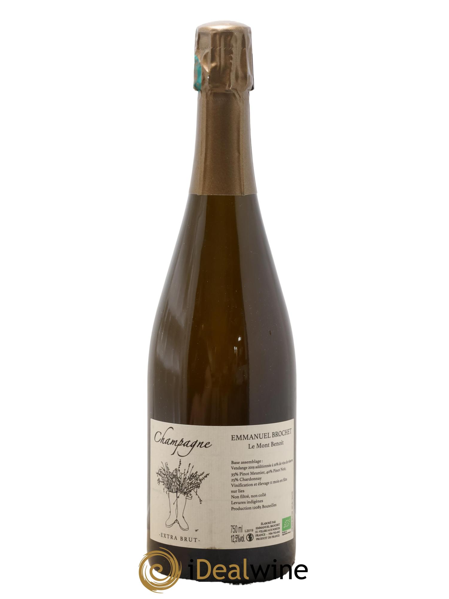 Le Mont Benoit est un premier cru qu'Emmanuel Brochet a choisi de magnifier à travers ce vin majoritairement composé de pinot meunier ainsi que de chardonnay et de pinot noir cultivés selon des principes biologiques et élevés en fûts de chêne. Quoiqu'animé d'une belle et grande fraîcheur, ce champagne nous séduit d'emblée par sa puissance. Il révèle ainsi un bouquet aromatique marqué par des notes de fruits jaunes et de fruits secs. Sa texture juteuse est néanmoins ravivée par une minéralité saisissante et une finale que l'on pourrait qualifier de "crayeuse".