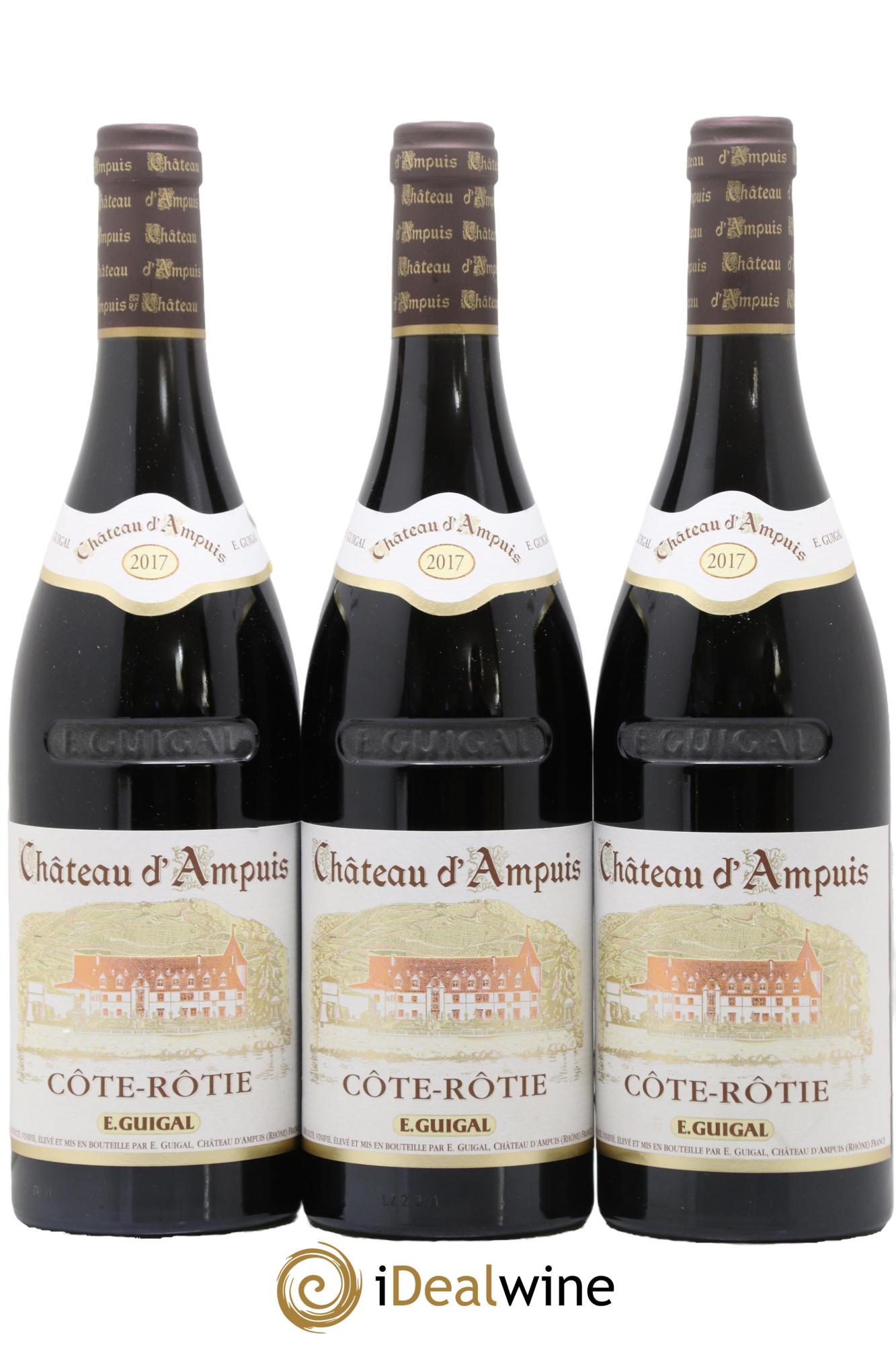 Elaborée depuis le millésime 1995, la cuvée Château d'Ampuis porte le nom d'une propriété acquise et rénovée par Marcel Guigal. Figurant parmi les « Trésors » de la maison Guigal, elle est issue de vignes d'un âge moyen de 35 à 40 ans, implantées sur sept terroirs d'exception en Côte-Rôtie. Les vendanges, les plus tardives possibles, sont suivies d'une période de fermentation en cuves inox, puis d'un élevage de 38 mois en fûts de chêne neuf. Le Château d'Ampuis présente une robe sombre et très profonde. Ce vin tannique et racé développe au nez des arômes d'épices, de petits fruits rouges, suivis en bouche de saveurs de pruneaux, de mûre et de vanille. D'une belle ampleur, nous percevons combien l'élevage intègre les tanins.