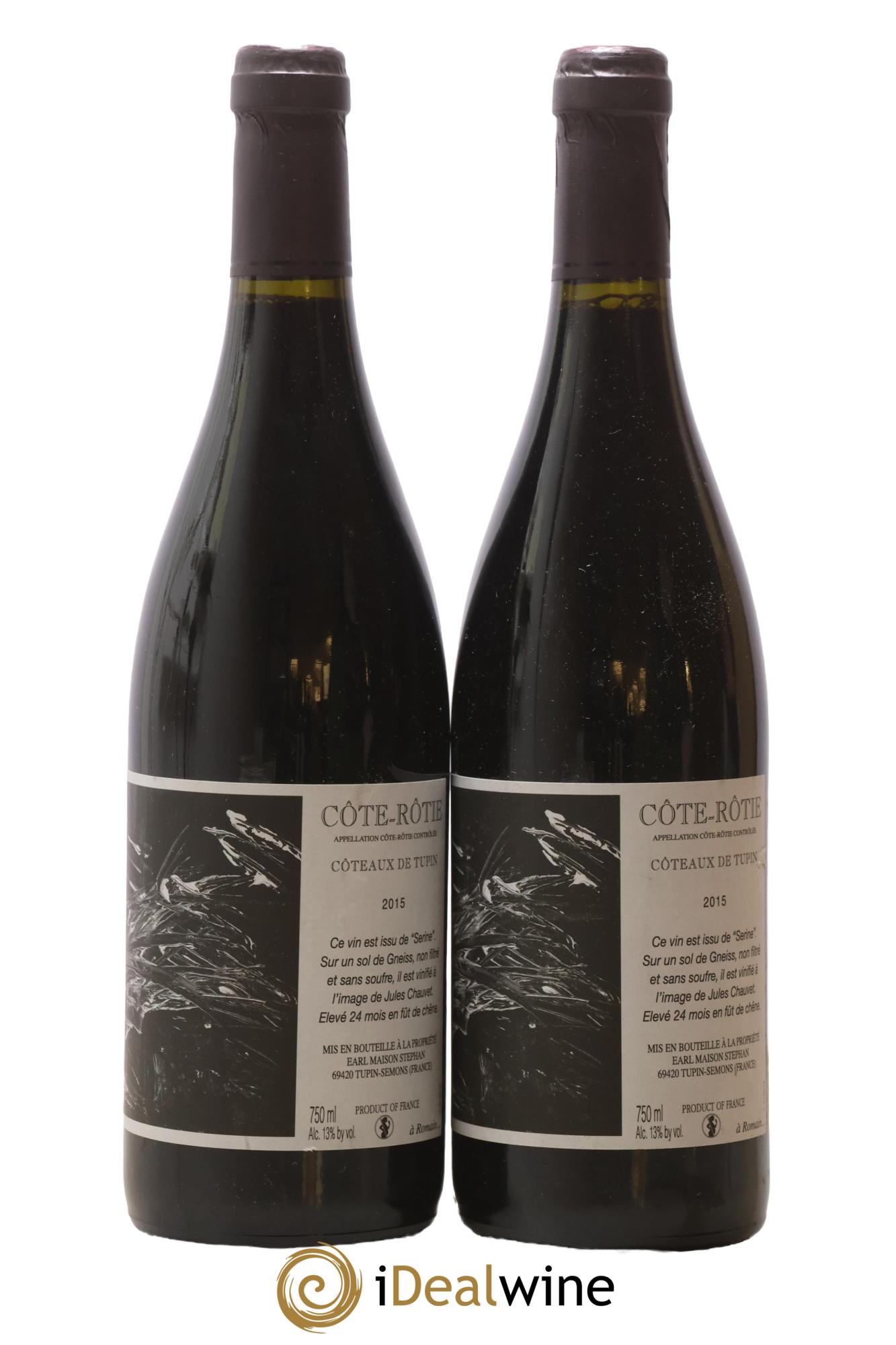 Coteaux de Tupin est une côte-rôtie composée de serine, très ancienne variété de syrah. Une fois récoltés, les grappes sont mises en chambre froide (3°C) pendant 24h avant le foulage de la vendange entière. S'ensuit une macération carbonique à froid (10°C) pendant 20 jours. La fermentation se fait de façon classique avec les levures indigènes, quelques pigeages et des remontages. Jean-Michel Stephan ne filtre ni ne colle son vin qui est élevé en barrique durant 36 mois. Puissance et richesse définissent ce vin fort en arômes de fruits noirs, d'épices et de fleurs. Avec le temps, le vin s'affine et gagne en élégance. A déguster avec une côte de bœuf grillée et des pommes de terre sarladaises.
