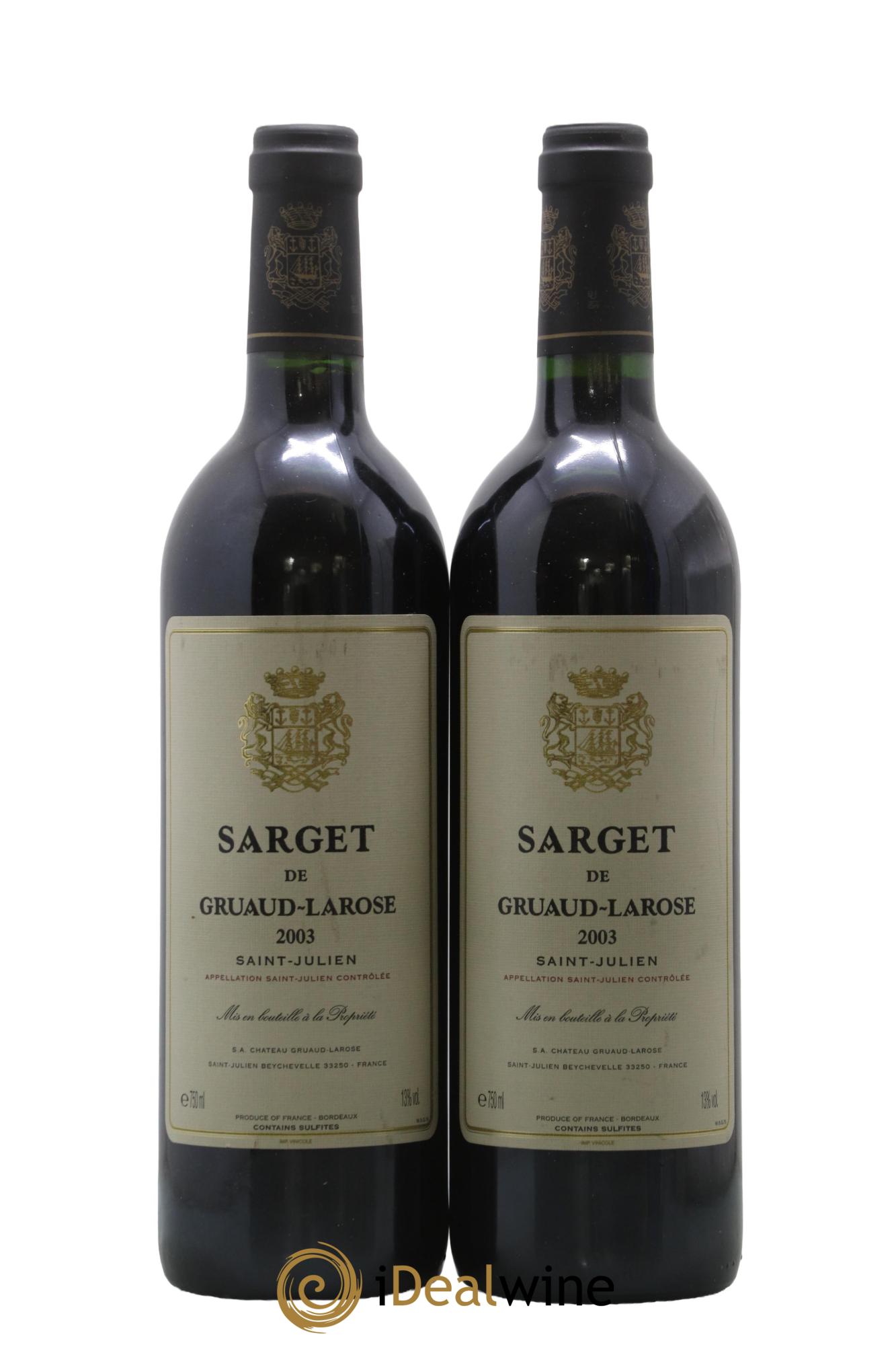 Second vin du château Gruaud-Larose, le Sarget est un vin qui allie finesse et équilibre. Il bénéficie des mêmes soins que le grand vin, mais se révèle plus rapidement charmeur. Actuellement, ils se montrent moins tanniques, moins rugueux, et allient finesse et équilibre. Leur robe est presque noire, ils libèrent des arômes puissants de fruits rouges. En bouche, ils se révèlent gras, pleins et riches.