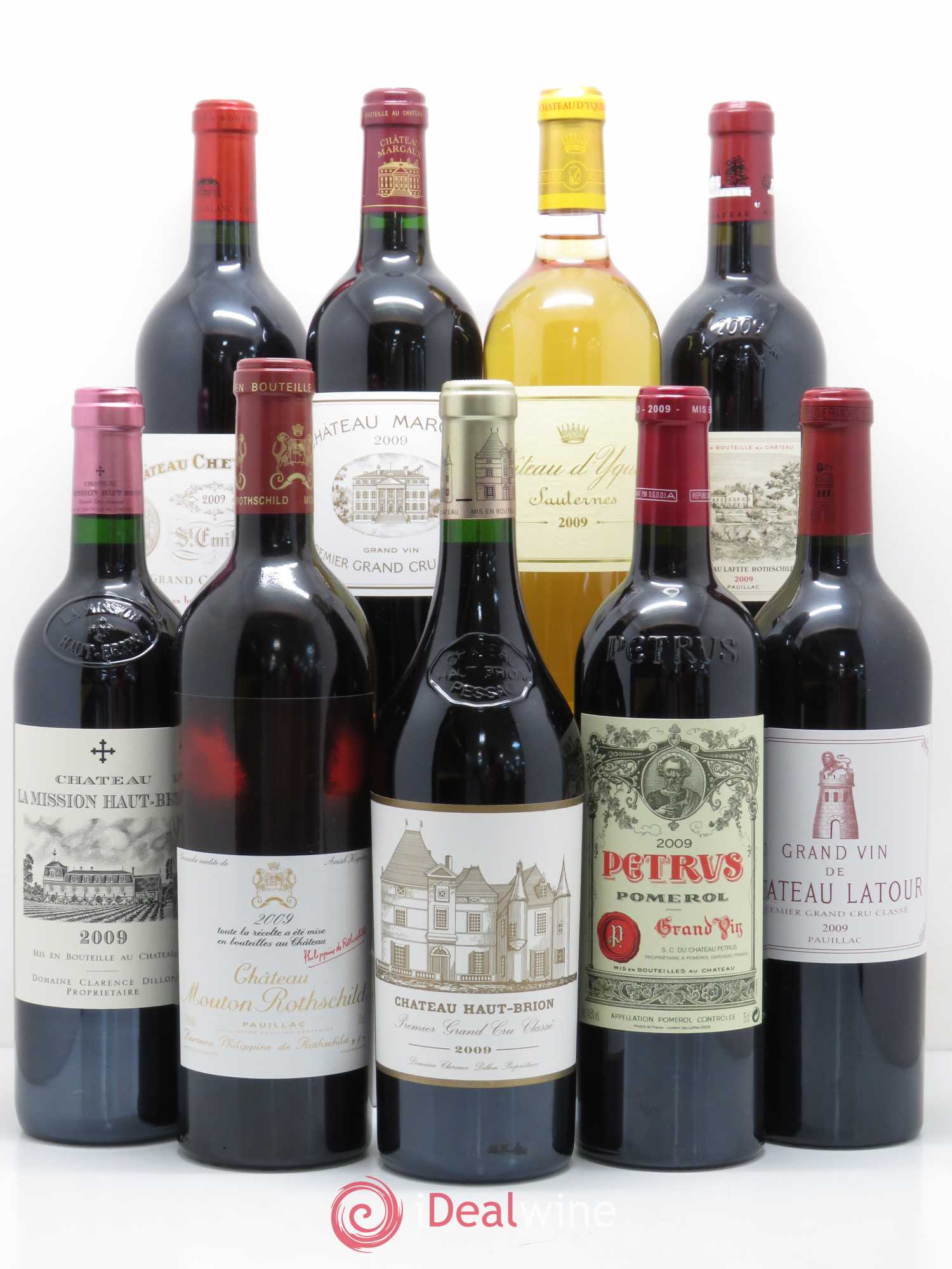 La Caisse Collection Duclot (9 bouteilles) est composée des vins suivants, dans le millésime 2009 : Petrus (1 bouteille), Château d'Yquem (1 bouteille), Château Cheval Blanc (1 bouteille), Château Lafite Rothschild (1 bouteille), Château Latour (1 bouteille), Château Margaux (1 bouteille), Château Mouton Rothschild (1 bouteille), Château Haut-Brion (1 bouteille), Château La Mission Haut-Brion (1 bouteille). Pour plus d'information sur ce lot, veuillez contacter le service client.