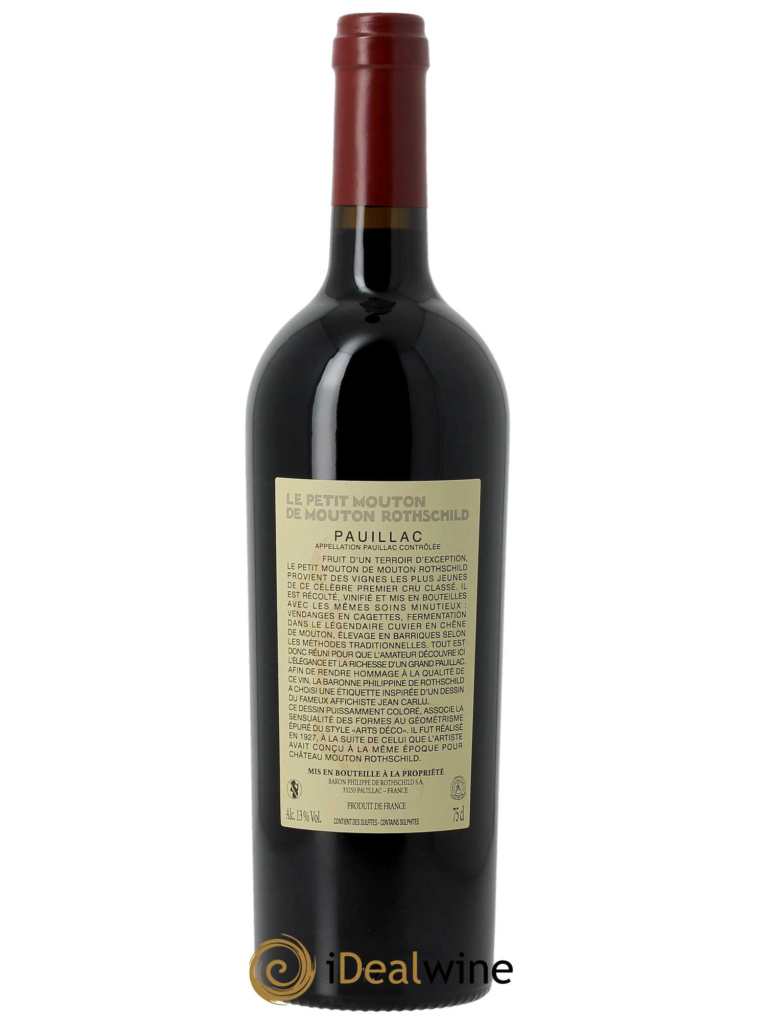 Plus d'infosProduit depuis le millésime 1993, le second vin du Château Mouton Rothschild porte le nom de la résidence de sa propriétaire, Philippine de Rothschild, située au coeur du domaine. Issu des vignes les plus jeunes du domaine, il est récolté puis vinifié avec le même soin que le grand vin. Il se distingue du grand vin notamment par sa proportion beaucoup plus grande de merlot. En ressort un vin aux arômes de fruits bien murs (cerise, mûre) et à la bouche ample, riche et charnue. Les bouteilles de Petit Mouton de Mouton Rothschild sont ornées d'une étiquette au graphisme inspiré de celle que réalisa Jean Carlu pour le millésime 1924 de Mouton Rothschild (premier millésime mis en bouteille au Château).