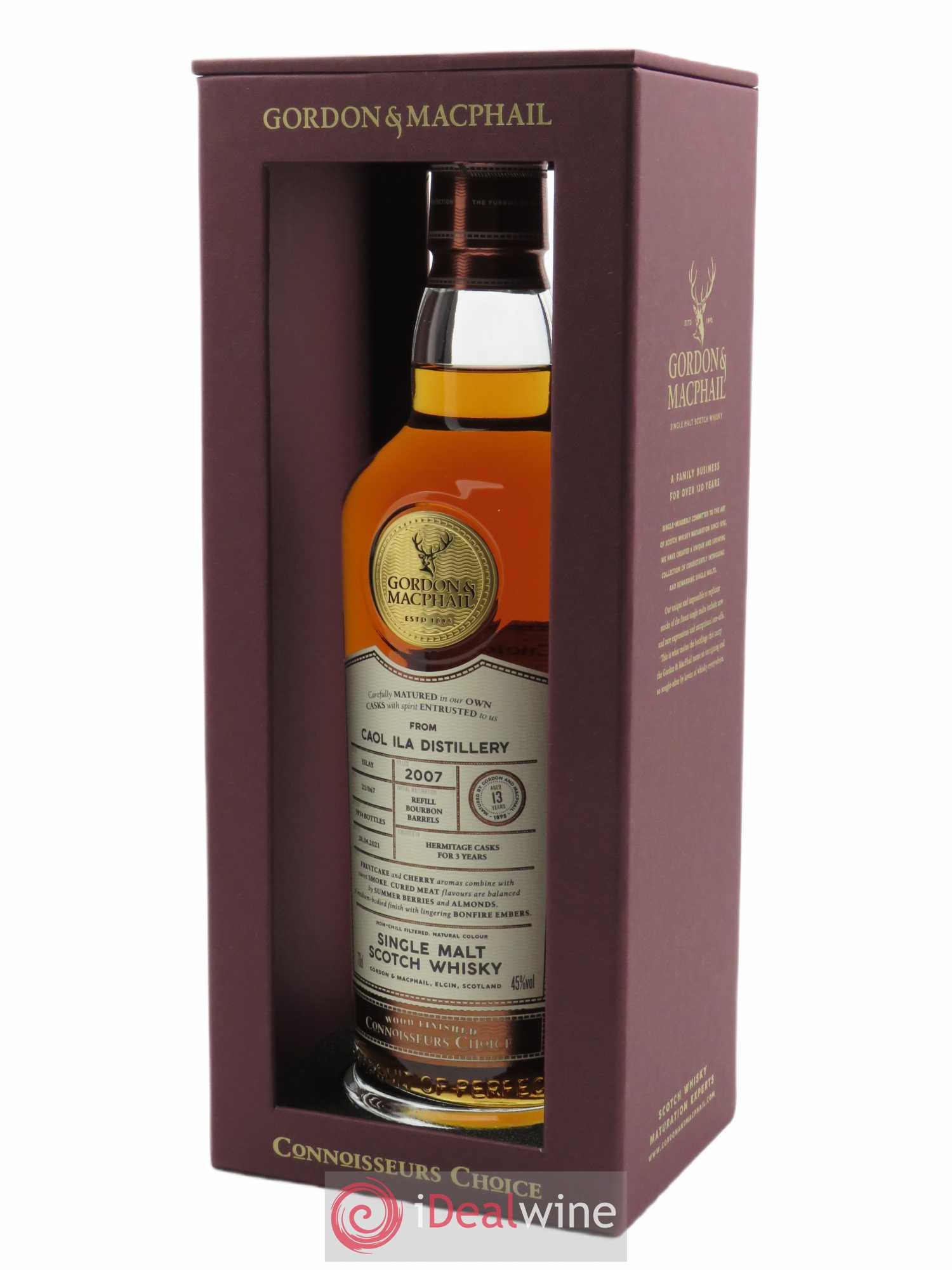 Avec sa gamme Connoisseur’s choice, Gordon & Macphail propose des singles malts rares, issus des meilleures distilleries écossaises. Le négociant se distingue par la grande attention accordée au choix des barriques qu’il fournit lui-même aux distilleries avant d’élever les nectars de longues années dans son chai situé à Elgin. Distillé en 2007 sur l’île d’Islay, au large de l’Ecosse, ce Coal Ila a ensuite passé 13 ans en anciens fûts de bourbon (chêne américain), avant un affinage de plusieurs mois en fûts d’hermitage rouge, grand vin du Rhône septentrional élaboré à partir de syrah. L’influence de ce fût de vin rouge dompte le caractère sauvage de Coal Ila, typiquement iodé et salin. Ici, ce caractère maritime se mêle à des notes de fruits rouges, de fraise et de framboise, et la tourbe se fait discrète. En bouche, après une attaque suave, le côté salin apparaît, allié aux épices avant une finale persistante marquée par la tourbe.