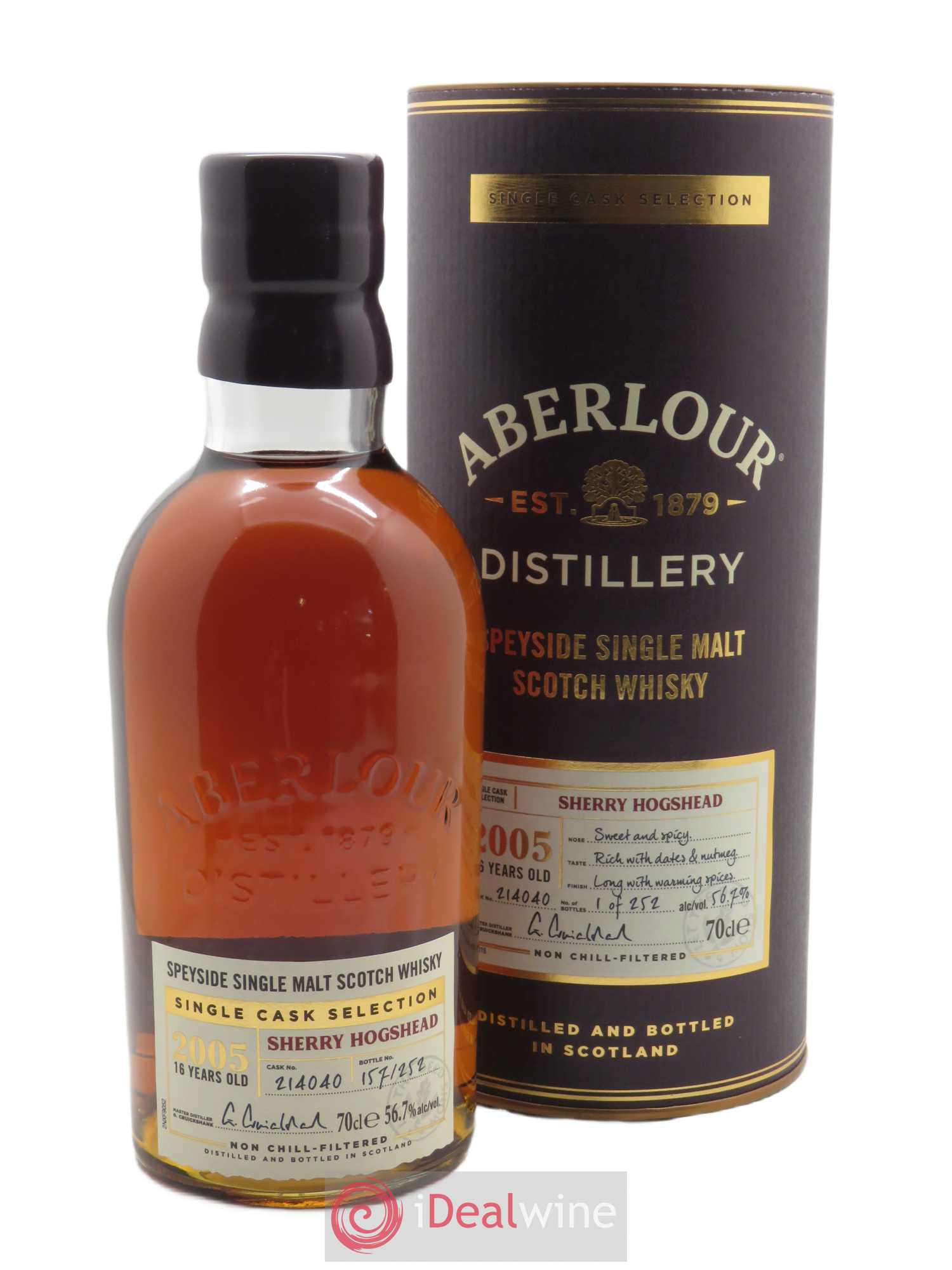 L’excellence d’Aberlour repose sur deux ingrédients essentiels, l’eau pure qui provient de la source Birkenbush, et l’orge cultivé dans un rayon de 25 km autour de la distillerie. Mais, une fois l’eau de vie distillée, c’est le choix des futs de chêne qui transforme le spiritueux incolore en whisky. Distillée en 2005, cette expression a ensuite passé 15 ans en fûts de xérès Hogshead, avant un embouteillage sans colorant ni filtration à froid à 56,7% abv.