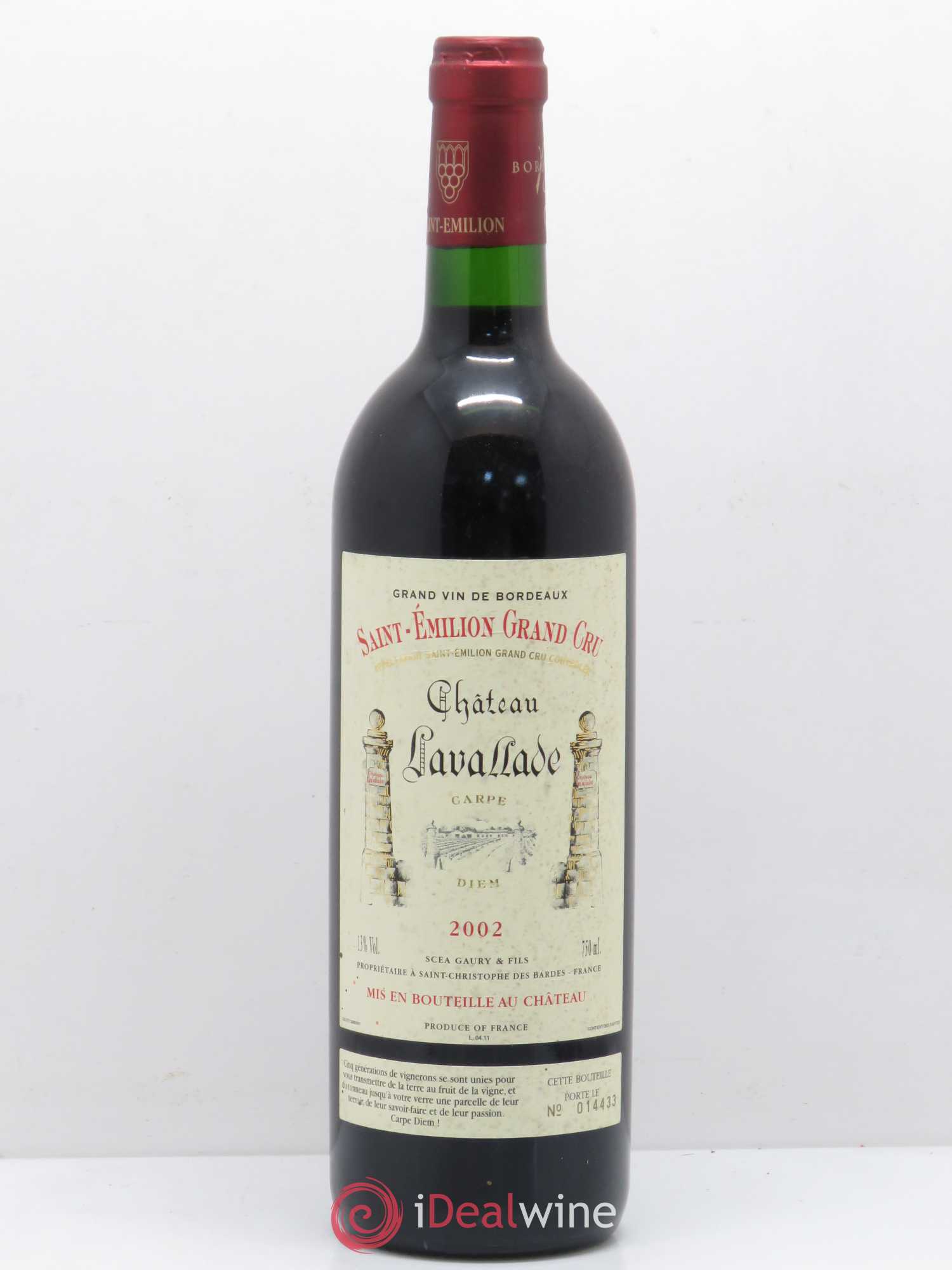 Plus d'infosQuantité : 1 bouteilleObservation : 1 Étiquette légèrement marquéeNiveau : 1 NormalProvenance : particulierTVA récupérable : nonRégion : BordeauxAppellation : Saint-Émilion Grand CruPropriétaire : Famille Gaury (SCEA Gaury & Fils)