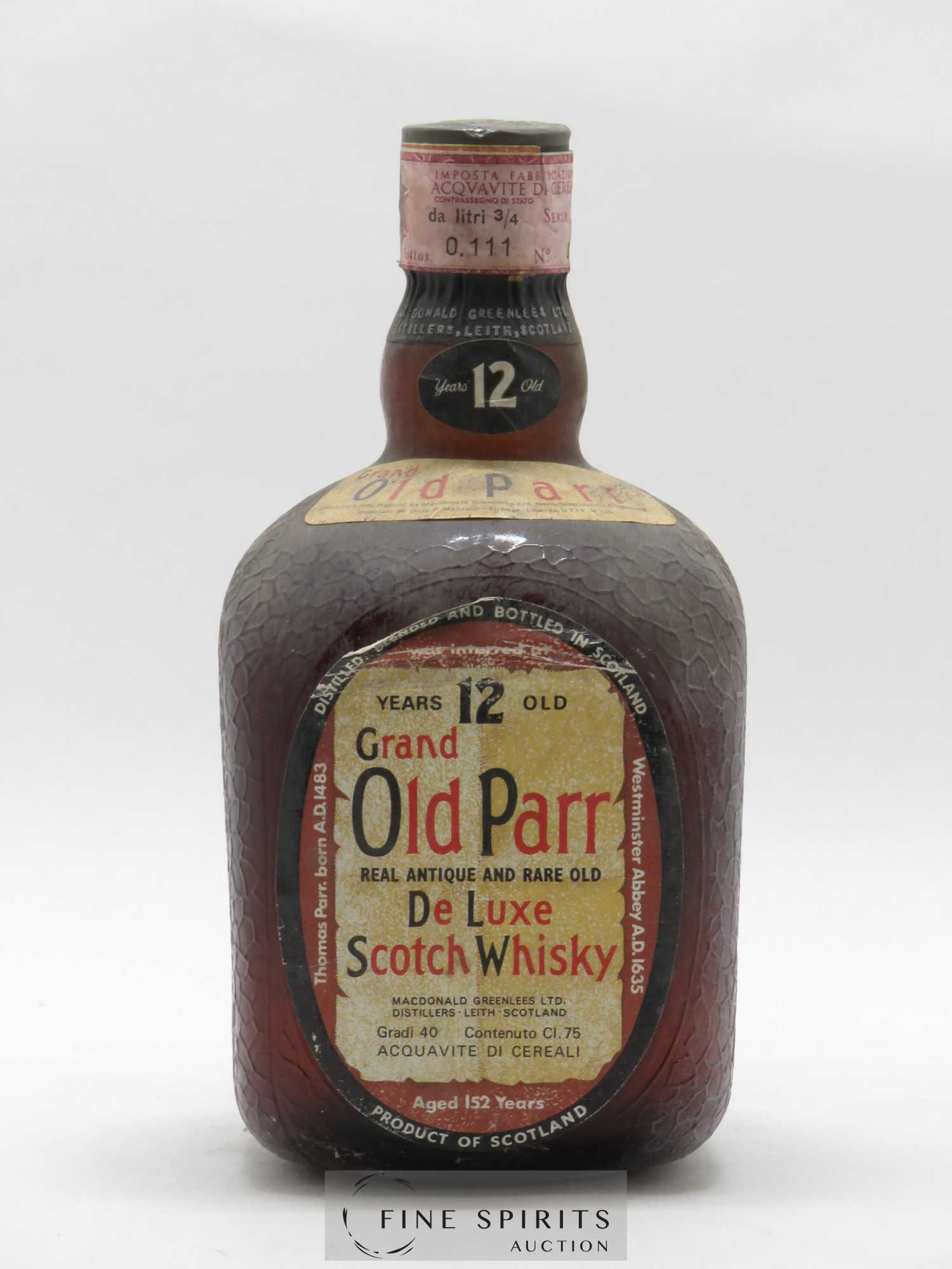 Célèbre marque de blend écossais, proposée par la société d'assemblage Macdonald Greenlees Ltd, celui-ci est âgé d'au moins 12 ans. Une mise en bouteille pour le marché italien, importateur R Manzuoli, avant le milieu des années 70, soit une distillation du début des années 60. Flacon muni d'une capsule noire estampillée et d'une banderole de douane italienne.