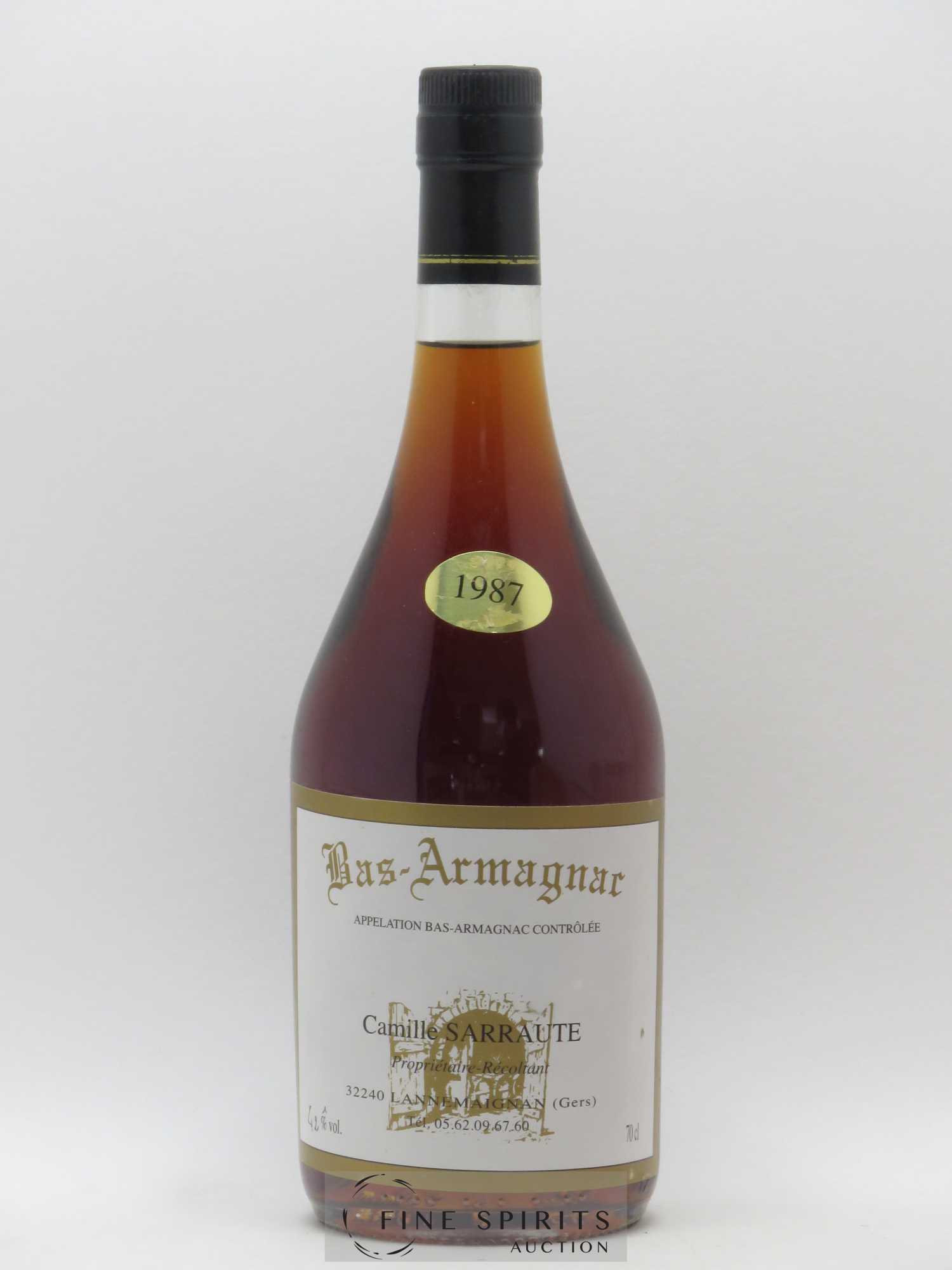 Bas Armagnac Camille Sarraute distillé en 1987. Le Bas Armagnac se caractérise par ses sols sablolimoneux, dits sables fauves, qui donnent des eaux-de-vie souples et fruitées.