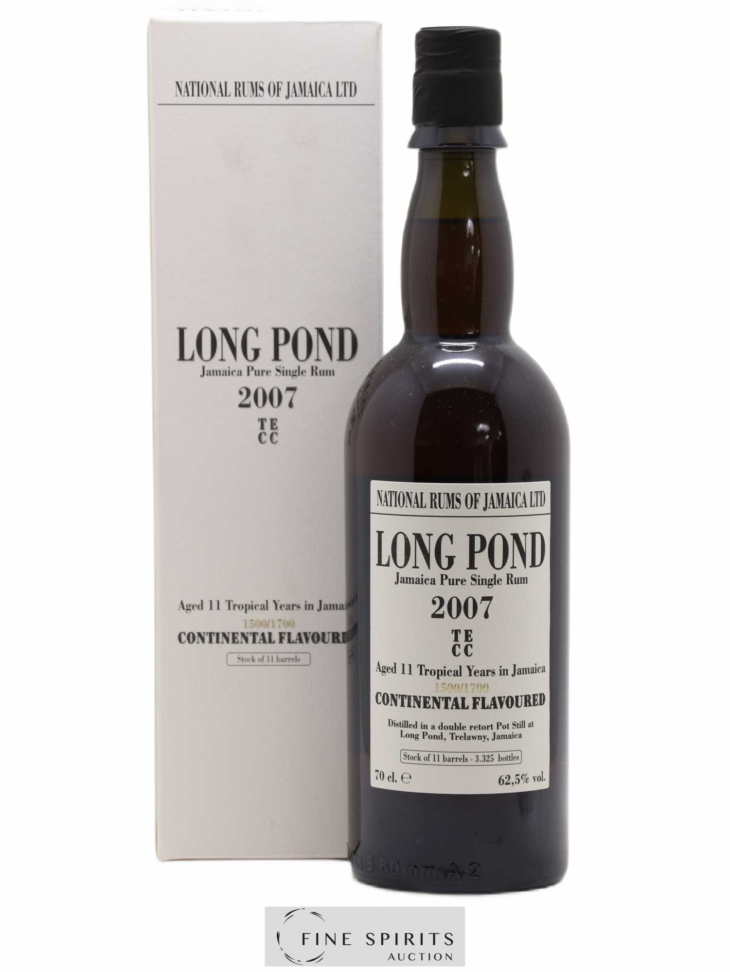 Long Pond distillé en 2007 et embouteillé après 11 ans d'élevage dans la gamme National Rums of Jamaica par La Maison & Velier, un partenariat entre La Maison du Whisky et l'importateur et négociant génois Velier. Il appartient à la catégorie "Continental Flavoured" (taux d'ester entre 700 et 1 600 g/HPA) et porte la marque TECC (entre 1 500 et 1 700 h/HPA). Assemblé à partir de onze fûts, cette cuvée est limitée à 3 325 bouteilles, la part des anges s'élevant à 57%. Plusieurs embouteillages de Long Pond étaient sortis dans cette série, montrant la diversité de styles dont la distillerie est capable.