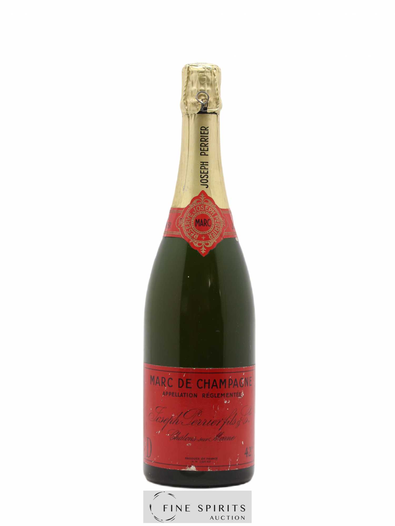 Marc de Champagne de la maison Joseph Perrier. Il s'agit d'une eau-de-vie de marc : les peaux, les pépins et éventuellement les rafles. Nous estimons que cette bouteille date des années 1960.