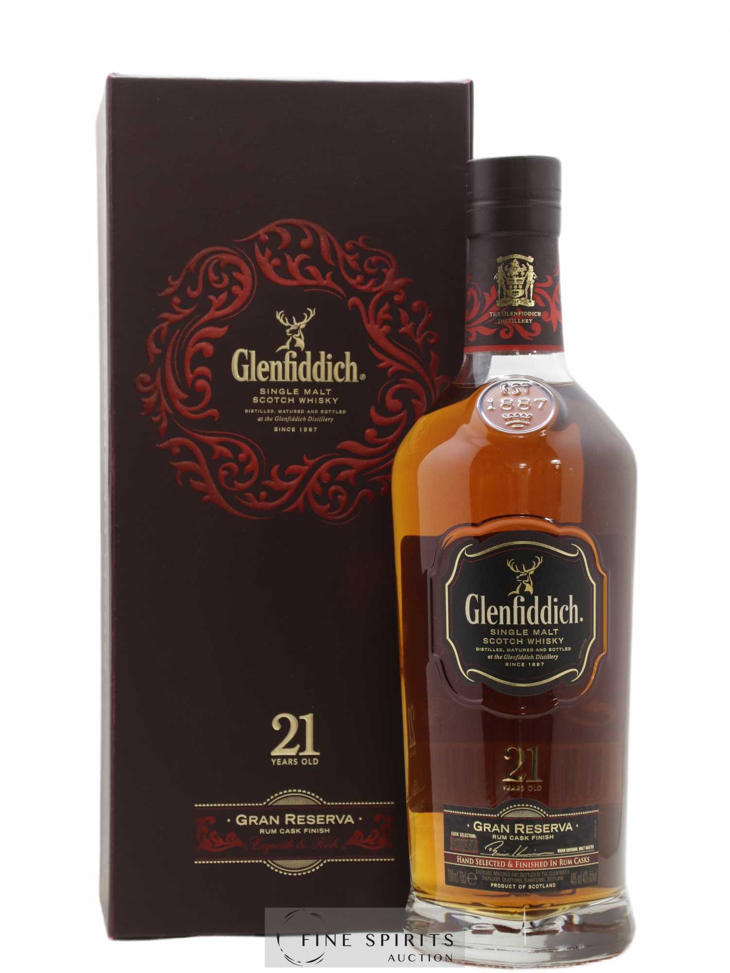 Familiale & indépendanteFondée en 1887 par William Grant, Glenfiddich est aujourd'hui classée parmi les cinq single malts les plus vendus au monde. Une success-story pour cette distillerie familiale qui a fait des mots « liberté » et « indépendance » une réalité de tous les jours en construisant sur son site sa propre chaîne de mise en bouteilles et sa propre tonnellerie. Connue pour son style équilibré et harmonieux, The Glenfiddich offrait au tout début des années 60 une version Straight Malt âgée de 8 ans au style fruité particulièrement irlandais. Mais Glenfiddich, c'est aussi et surtout une gamme de single casks millésimés « Vintage Reserve » dont The Glenfiddich 1963, ou encore « Private Vintage » avec The Glenfiddich 1955. Plus récemment, la série Rare Collection a fait des émules à travers le monde et offre de magnifiques versions d'âges vénérables oscillant entre 40 et 50 ans. Deux flacons se distinguent plus particulièrement, The Glenfiddich 64 ans 1937 lancé en 2001 et Glenfiddich 50 ans 1939 lancé au tout début des années 90.