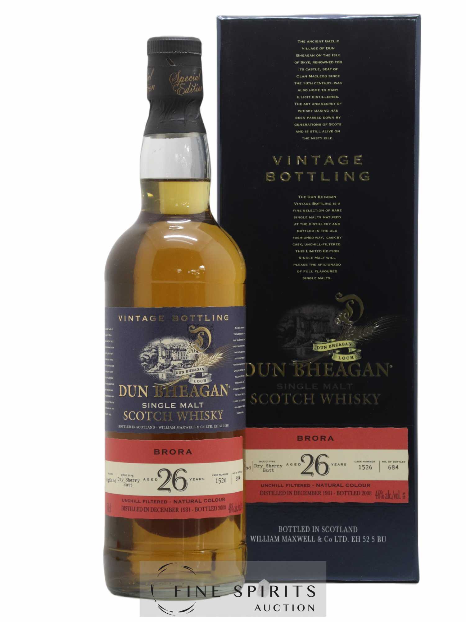 Single cask (#1526) de Brora 26 ans 1981 embouteillé en 2008 par Ian Macleod. Ian Macleod & Company Ltd est fondé en 1933 par Leonard Russell Senior. La famille Russell en fait l'acquisition en 1963 et Peter Russell en prend la tête. Ian Macleod embouteille alors des blends et des embouteillages indépendants dont les célèbres Chieftain’’s, une gamme de single cask capitalisant sur les stocks amassés par Leonard Russell Senior depuis la création de sa société de courtage en 1936. L'entreprise devient Ian Macleod Distillers Ltd en 2003 dans la foulée de l'acquisition de Glengoyne puis Tamdhu en 2011 et Rosebank en 2017. Dun Bheagan est une gamme de single malts qui tire son nom d'un château sur l'île de Skye. Édition limitée à 684 bouteilles.