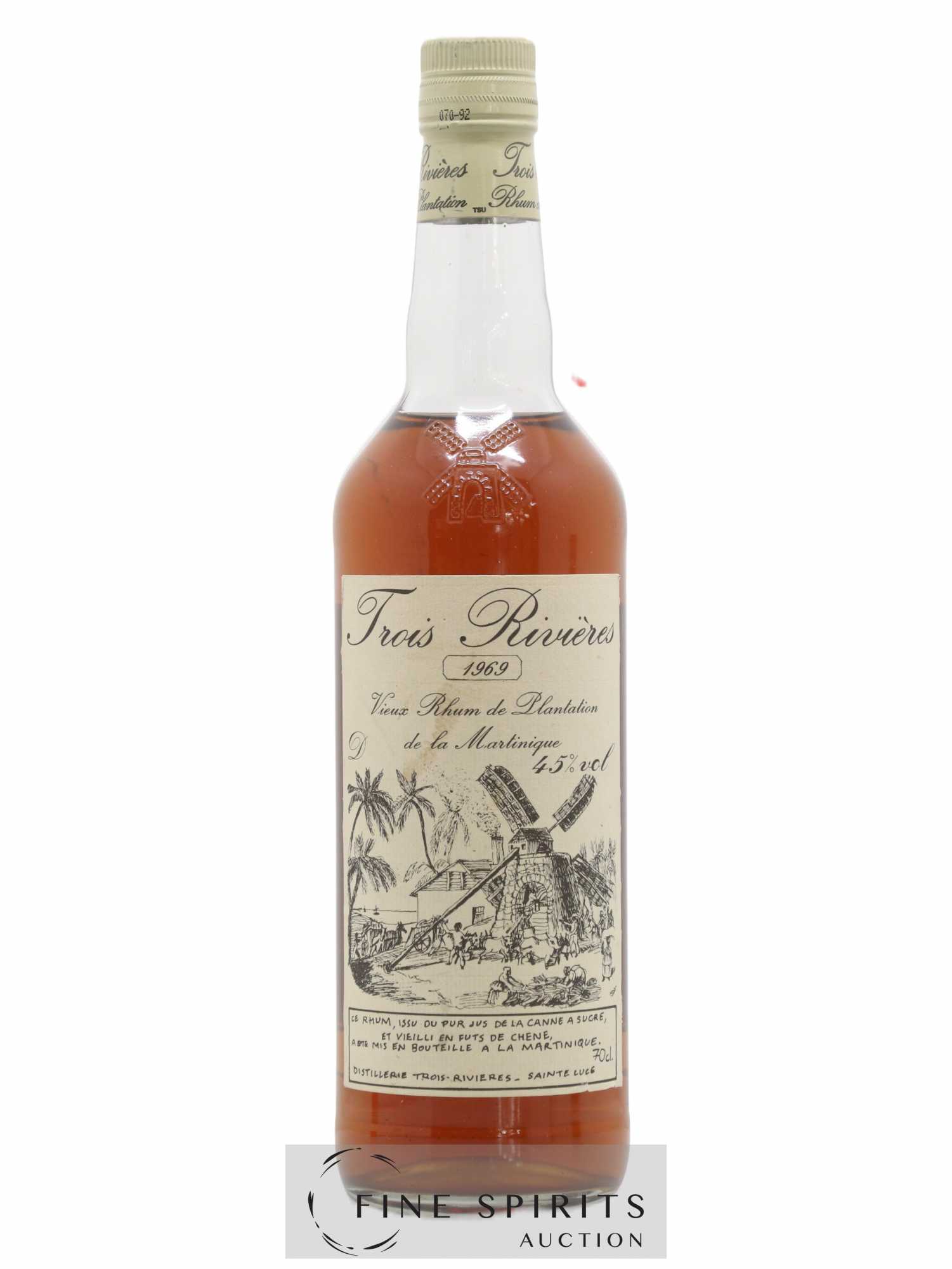 Rhum agricole - issu du pur jus de la canne à sucre - vieux Trois Rivières distillé en 1969 et élevé en fût de chêne. A partir de 1940, Trois Rivières abandonne l'usage de la mélasse pour produire son rhum et se consacre au rhum agricole. Le Trois Rivières 1953 est le premier d'une série de rhums millésimés sortis par la distillerie.