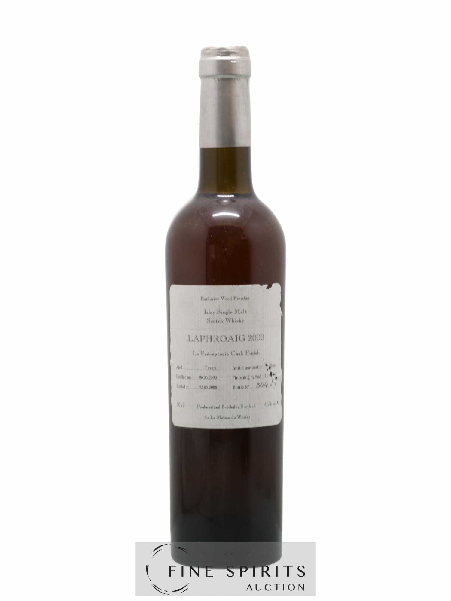 Laphroaig 7 ans 2000 embouteillé en 2008 par Signatory Vintage après un affinage de 11 mois en fût de vin du domaine La Préceptorie. Signatory Vintage a été fondé en 1988 par Andrew Symington qui a commencé son activité au Prestonfield House d'Édimbourg où il sélectionne des fûts spécialement pour l'hôtel. En 2002, il fait l'acquisition de la distillerie Edradour, à Pitlochry dans les Highlands. Il y relocalise aussi Signatory Vintage dont les chais font face à la distillerie. Edition limitée à 470 bouteilles pour La Maison du Whisky, un importateur et distributeur de whisky et de spiritueux fondé en 1956 par Georges Bénitah.