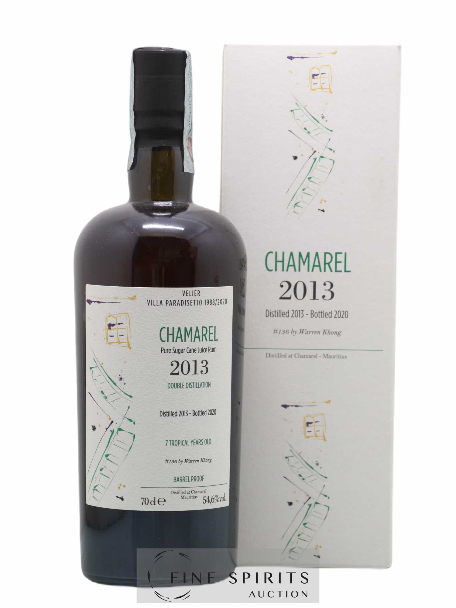 Chamarel 7 ans distillé en 2013 et embouteillé en 2020 par Velier. Il fait partie d'une série de six embouteillages rendant hommage à la villa Paradisetto occupée par Velier pendant 32 ans avant le déménagement de l'entreprise. Les étiquettes sont l'œuvre de l'artiste singapourien Warren Khong. Velier est fondé par Casimir Chaix à Gênes en 1947. C'est une petite entreprise familiale dont l'activité est l'importation et la distribution de vin et de spiritueux. Luca Gargano, ancien représentant de Saint James et grand amateur et collectionneur de rhum, la rachète en 1986 et lance son activité de négoce, d'abord avec le whisky en 1992 puis avec le rhum en 1996. Après des embouteillages légendaires de rhums de Demerara (Guyana) et de Caroni (Trinidad), Luca Gargano a poursuivi son explorations des rhums des Caraïbes avec d'autres territoires comme la Barbade, la Jamaïque, Haïti ou Marie-Galante. Les rhums sectionnés par Velier ont la particularité de n'avoir été élevés que sous climat tropical d'où une concentration aromatique et une part des anges considérables. Il les embouteille généralement brut de fût ou avec de légères réductions.