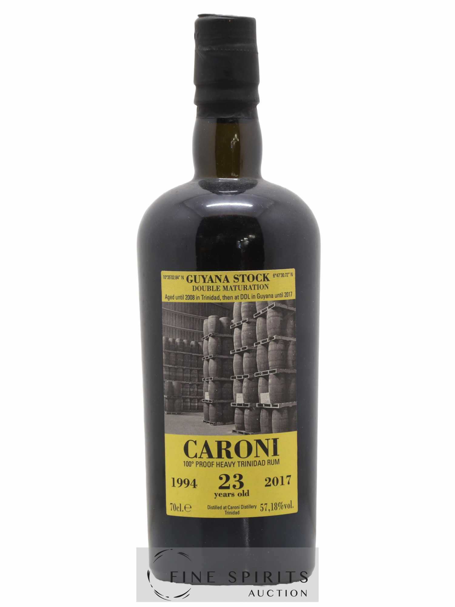 Caroni distillé en 1994 et embouteillé en 2017 après 23 ans de maturation en climat tropical (part des anges : 85%), d'abord à Trinidad puis, à partir de 2008, dans les chais de Demerara Distillers Ltd. au Guyana.