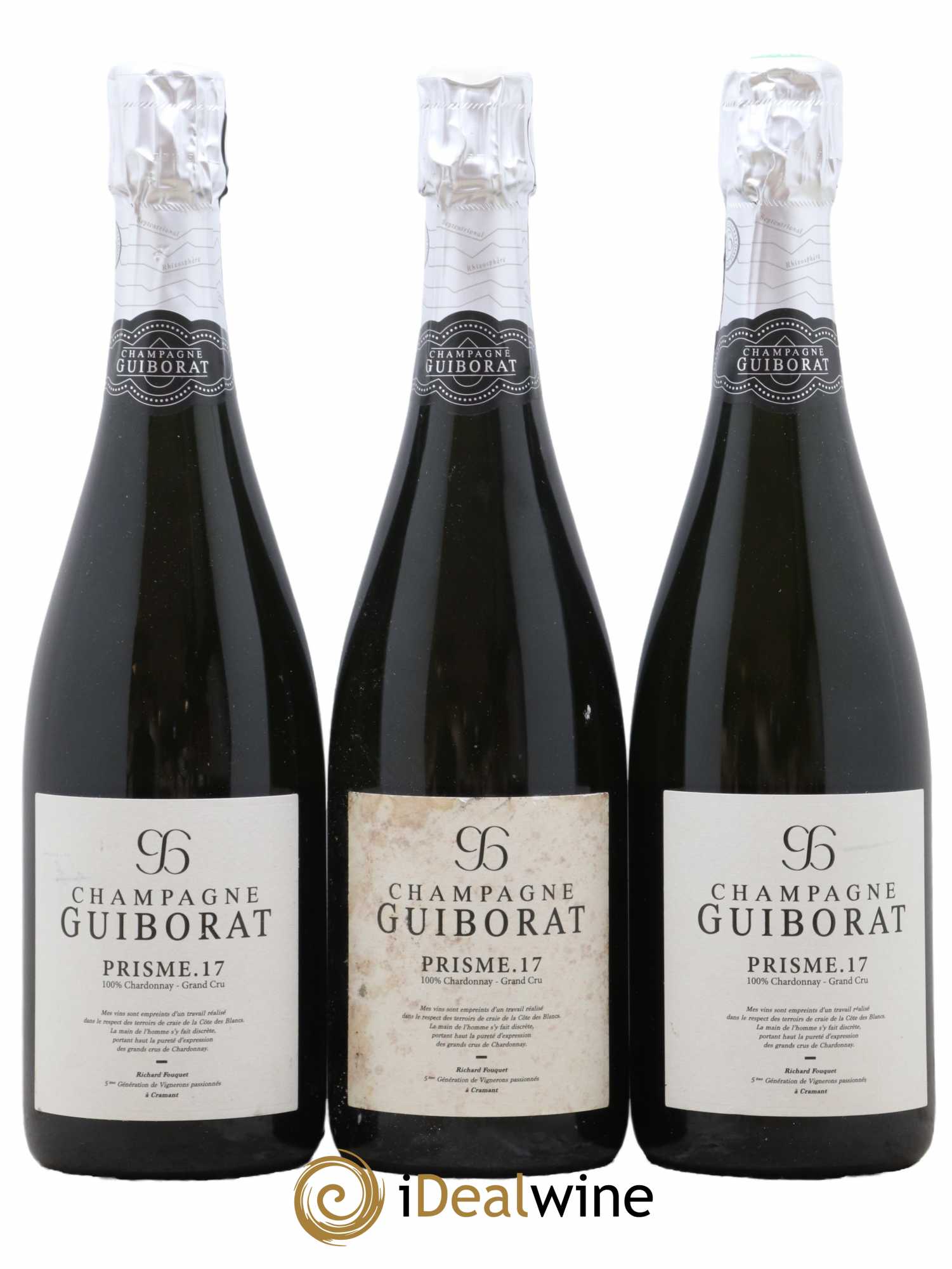 La maison champenoise Guiborat nous propose la cuvée Prisme 17, un flacon qui, comme son nom le précise, provient du millésime 2017. Il est composé de raisins cultivés au sein de quatre parcelles différentes selon des méthodes raisonnées : Les Bergeries et Moyen à Cramant, Les Caurès à Chouilly et Gros Mont à Oiry. Les vignes puisent les nutriments nécessaires à leur épanouissement dans des sols composés de craie blanche, de limon et de cailloux.