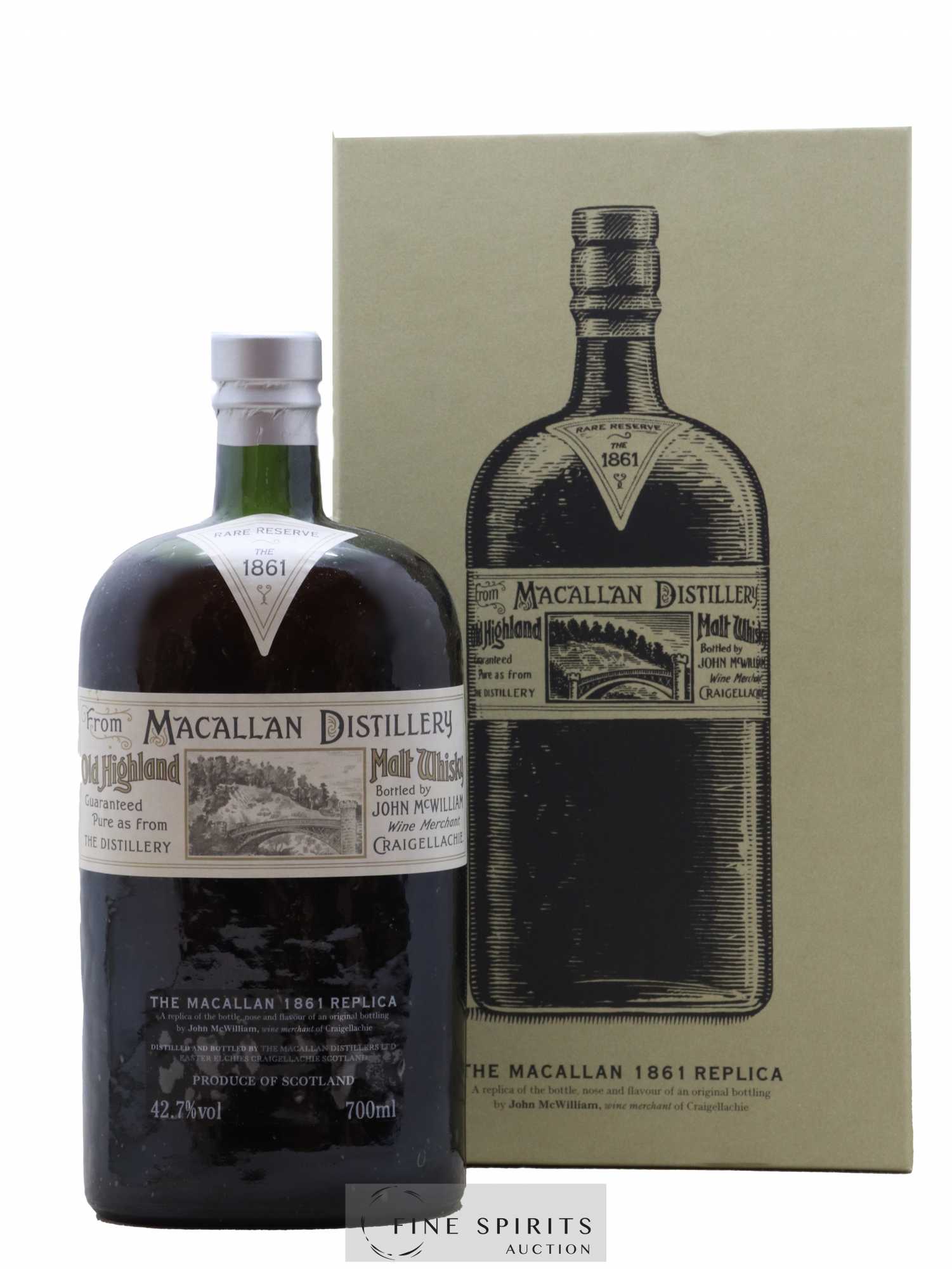 Lanciata tra il 2002 e il 2003, la serie Macallan Replica mira a ricreare il gusto e l'aspetto dei Macallan di una volta. Nelle cantine delle distillerie, il 1841, 1861, 1874 e 1876 vengono ricreati con precisione grazie a vecchie bottiglie da collezione acquistate qualche anno prima. È stato solo dopo il lancio di questa nuova gamma, che alcune indagini hanno messo in dubbio l'autenticità delle bottiglie del XIX secolo acquistate da Macallan. La collezione creata prendendo come esempio dei falsi è stata quindi immediatamente rimossa dagli scaffali della distilleria. Queste repliche sono comunque di grande qualità e sono molto ricercate! Questa è la Replica del 1861, imbottigliata a 17.000 esemplari.